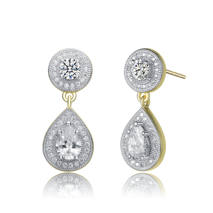 Handcrafted in sterling silver with rhodium and gold plating. Features a prong-set pear-cut cubic zirconia centerpiece. Accented with round cubic zirconia stones for additional brilliance. Secured with butterfly closures for a secure fit.