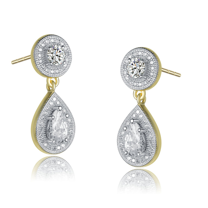 These Genevive Sterling Silver Gold Plated Cubic Zirconia Teardrop Earrings bring graceful elegance to any look. A dazzling pear-cut cubic zirconia sits at the center, framed by shimmering round stones that enhance its radiance. The blend of rhodium and gold plating adds warmth and depth to the design.