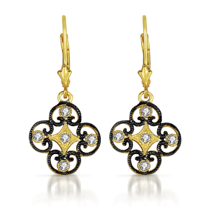 These Genevive Jewelry Sterling Silver Black and Gold Plated Cubic Zirconia Drop Earrings offer a vintage-inspired elegance with their intricate Art Deco swirl design. The floral-inspired motif, enhanced by shimmering clear cubic zirconia accents, creates a striking contrast against the black and gold finish. A sophisticated statement piece.