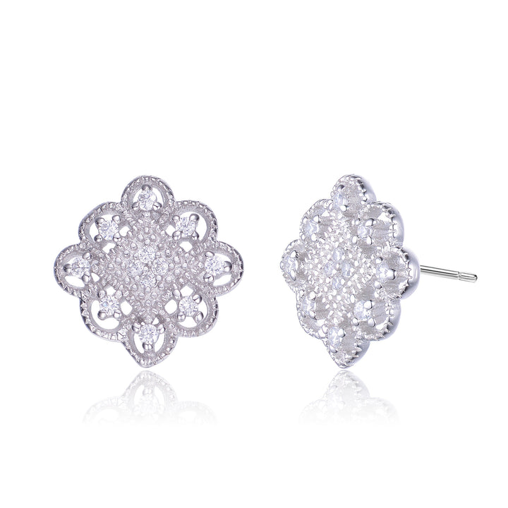 Made in sterling silver with rhodium plating for enhanced durability. Set with clear round-cut cubic zirconia stones in a lace-inspired floral pattern. Secured with butterfly closures for a comfortable fit.