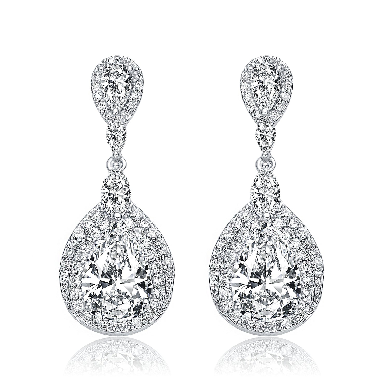 Crafted in sterling silver with rhodium plating for lasting brilliance. Set with pear, round, and marquise-cut clear cubic zirconia stones. Designed with butterfly clasps for a secure fit.