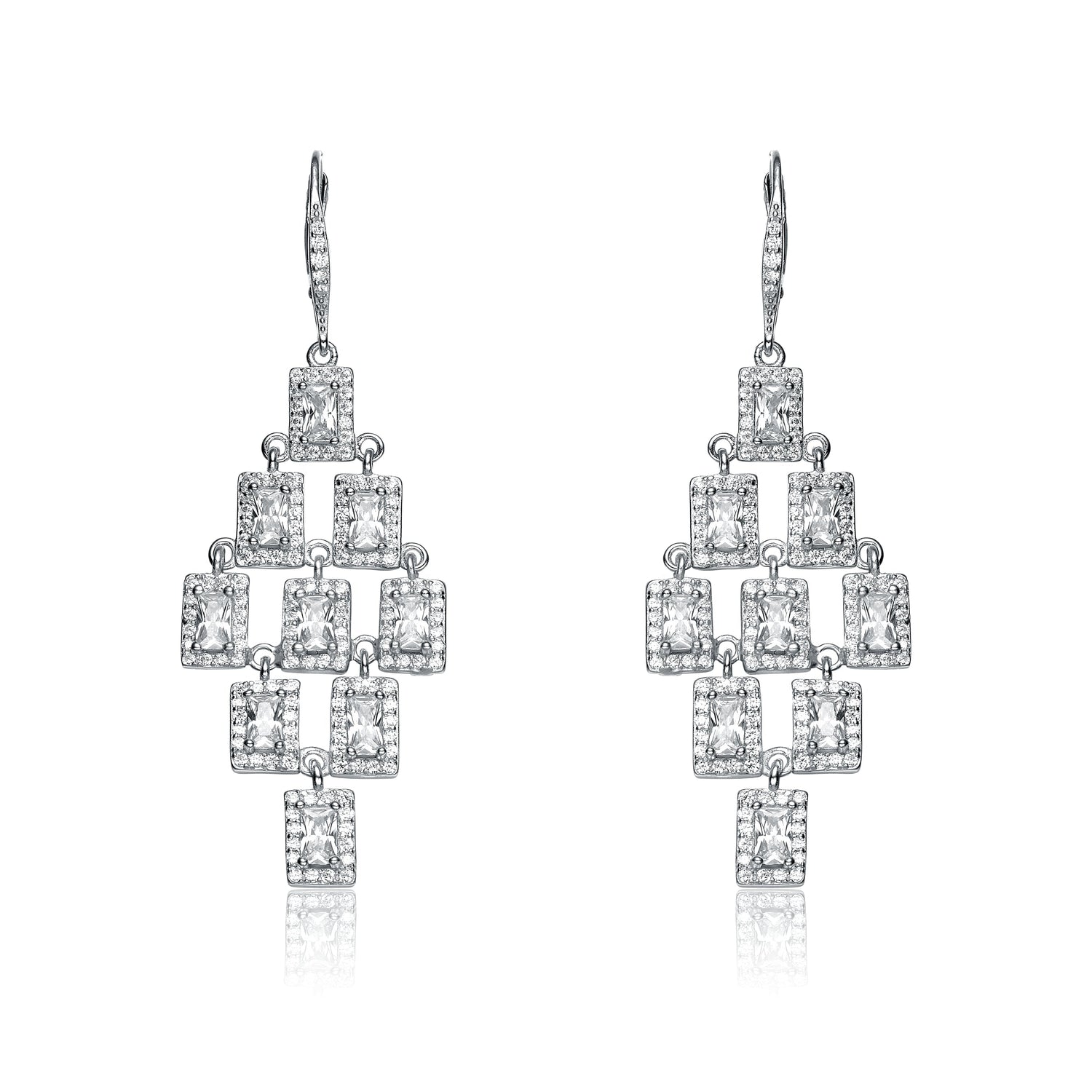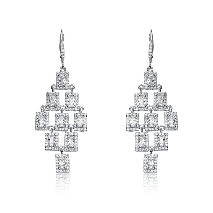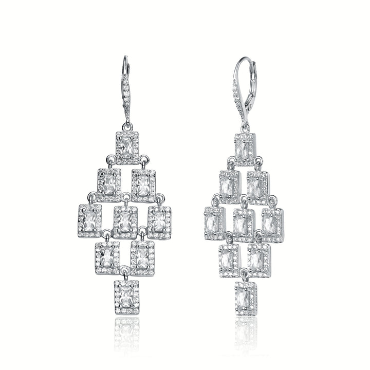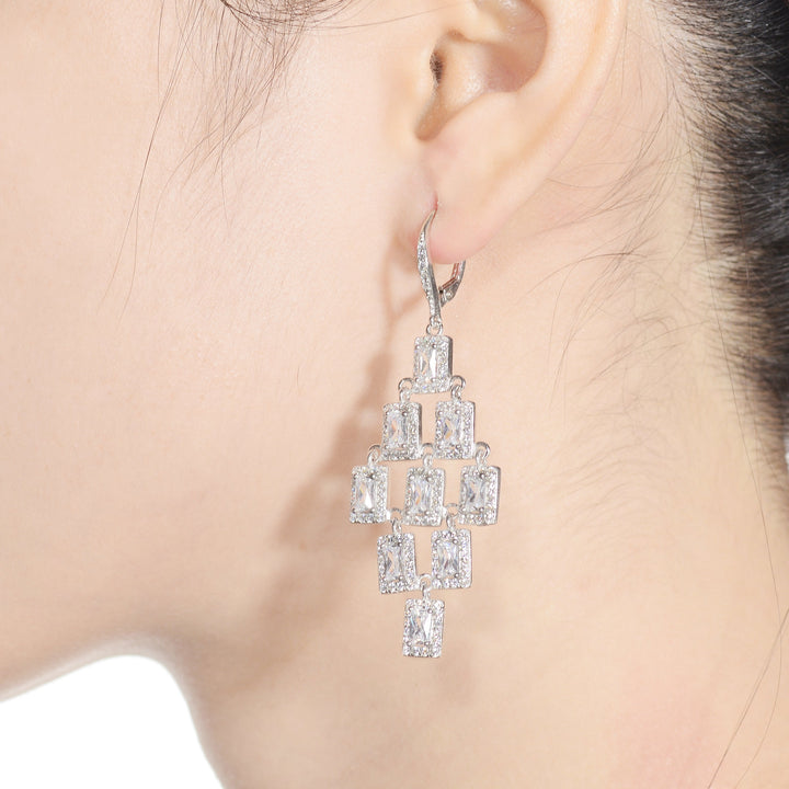Crafted in sterling silver with rhodium plating for enhanced durability. Features clear cubic zirconia stones set in a cascading chandelier design. Secured with butterfly closures for a secure and comfortable fit.