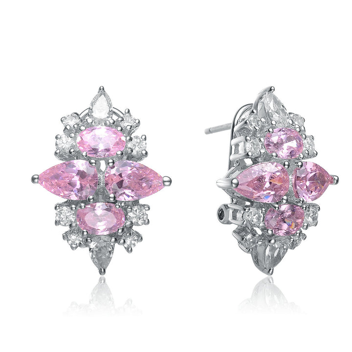 Made in sterling silver with rhodium plating for a refined finish. Features pear-cut pink cubic zirconia stones accented by clear pear and round cubic zirconia stones. Secured with omega closures for a secure fit.