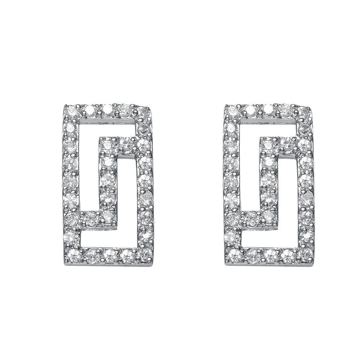 Made in sterling silver with rhodium plating for lasting brilliance. Features a geometric grid design adorned with clear round-cut cubic zirconia stones. Secured with butterfly closures for comfortable wear.