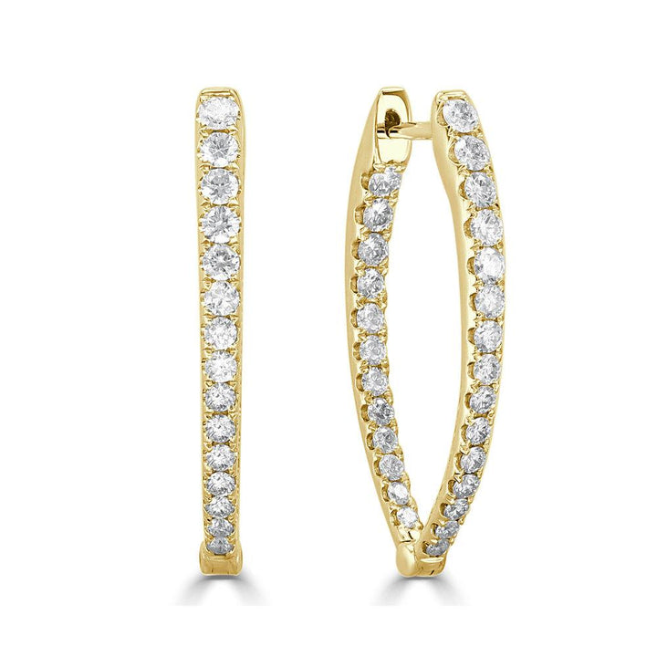 Made in 14K gold for a radiant finish. Adorned with 1.11 ct. total diamond weight (G-H color, SI clarity). Designed with an inside-out oval hoop style for maximum brilliance. Measures 1.25'' in diameter.