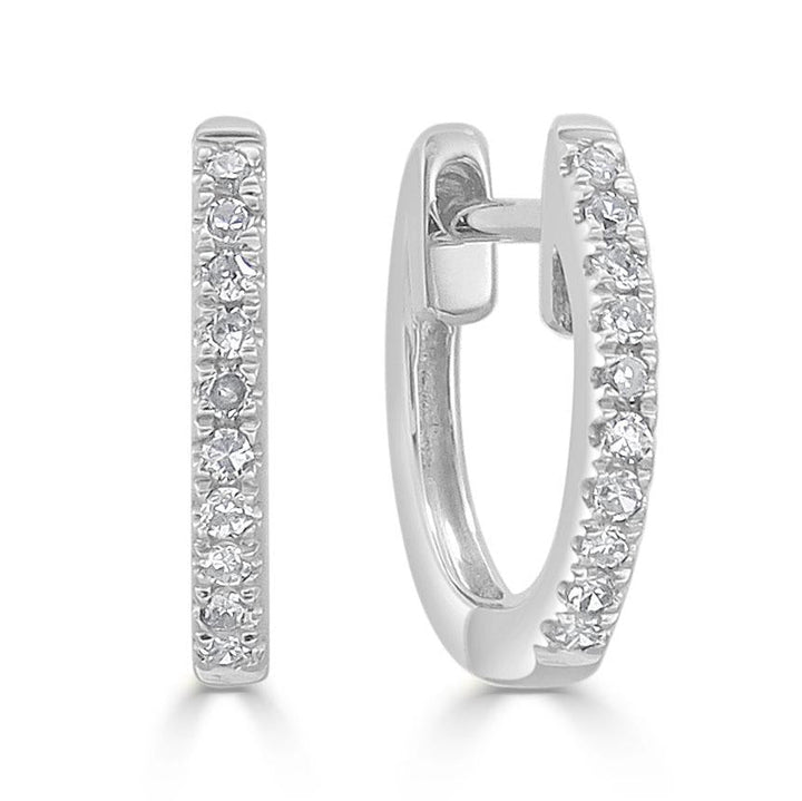 Made in 14K gold for a refined, high-end aesthetic. Features 0.06 ct. total diamond weight (G-H color, SI clarity). Designed with a 10mm diameter for a snug, comfortable fit. Secured with a hinged huggie closure.