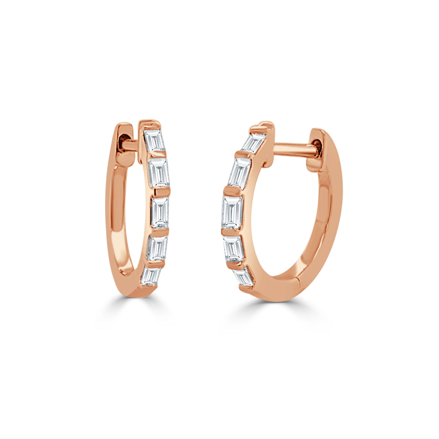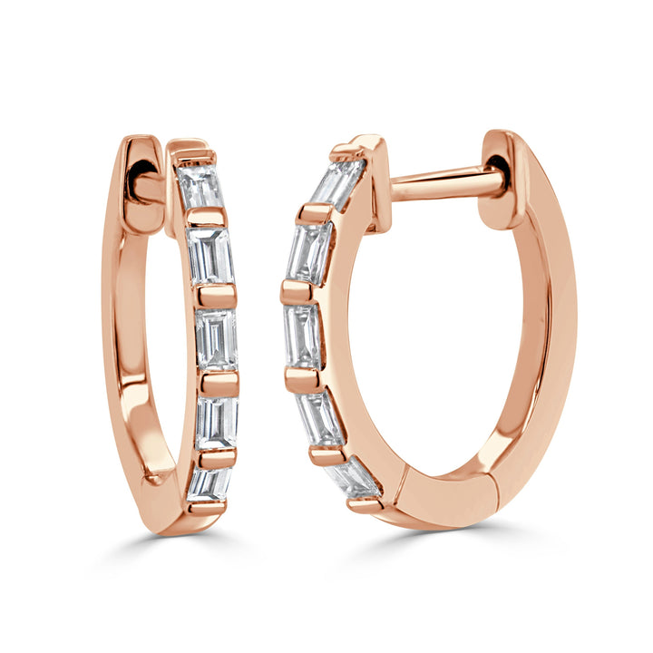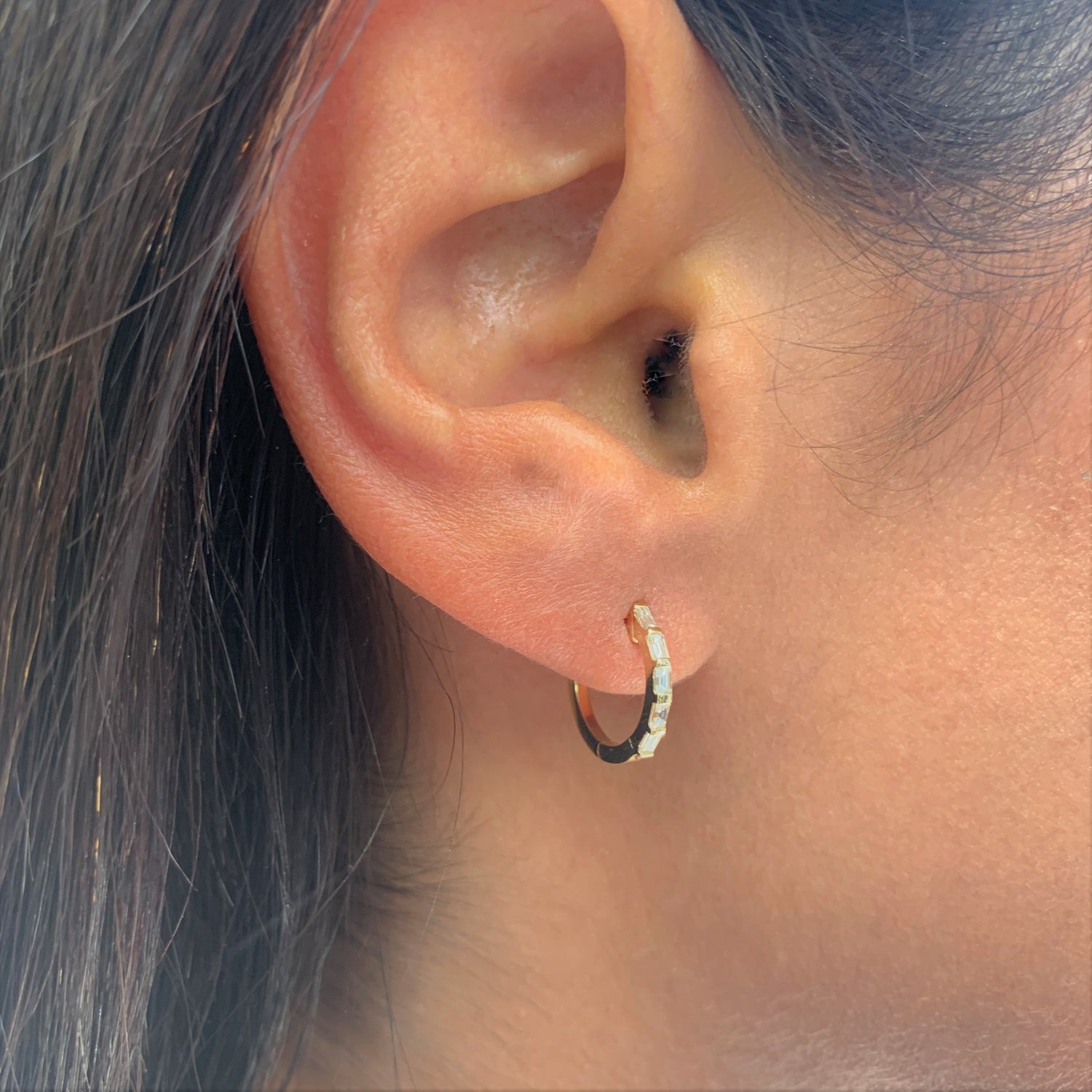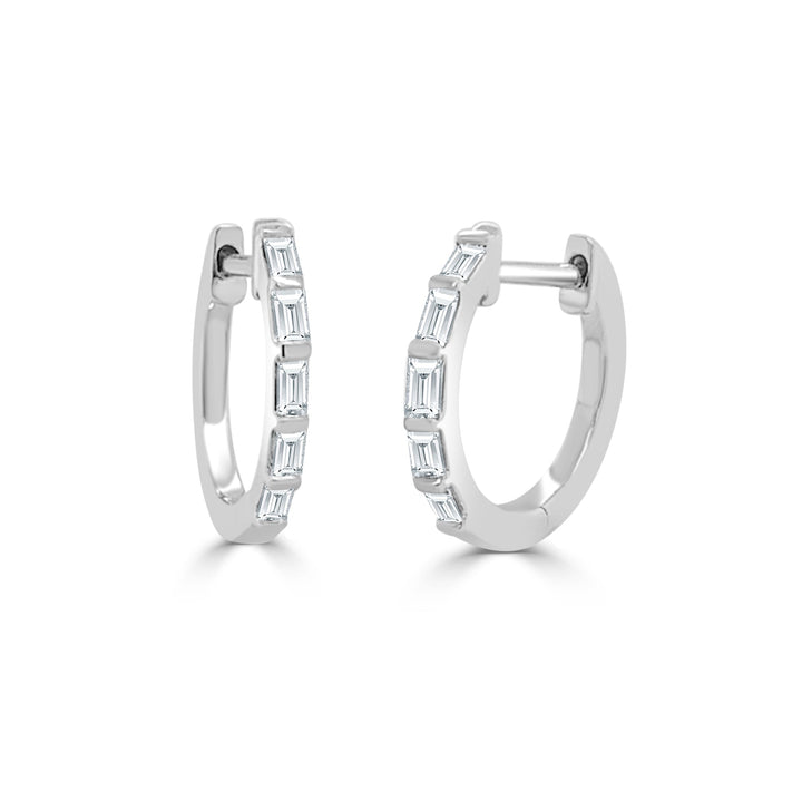 Crafted in 14K gold for lasting brilliance. Set with 0.24 ct. total baguette diamond weight. Designed with a 1/2-inch diameter for a close fit. Secured with a hinged huggie closure.