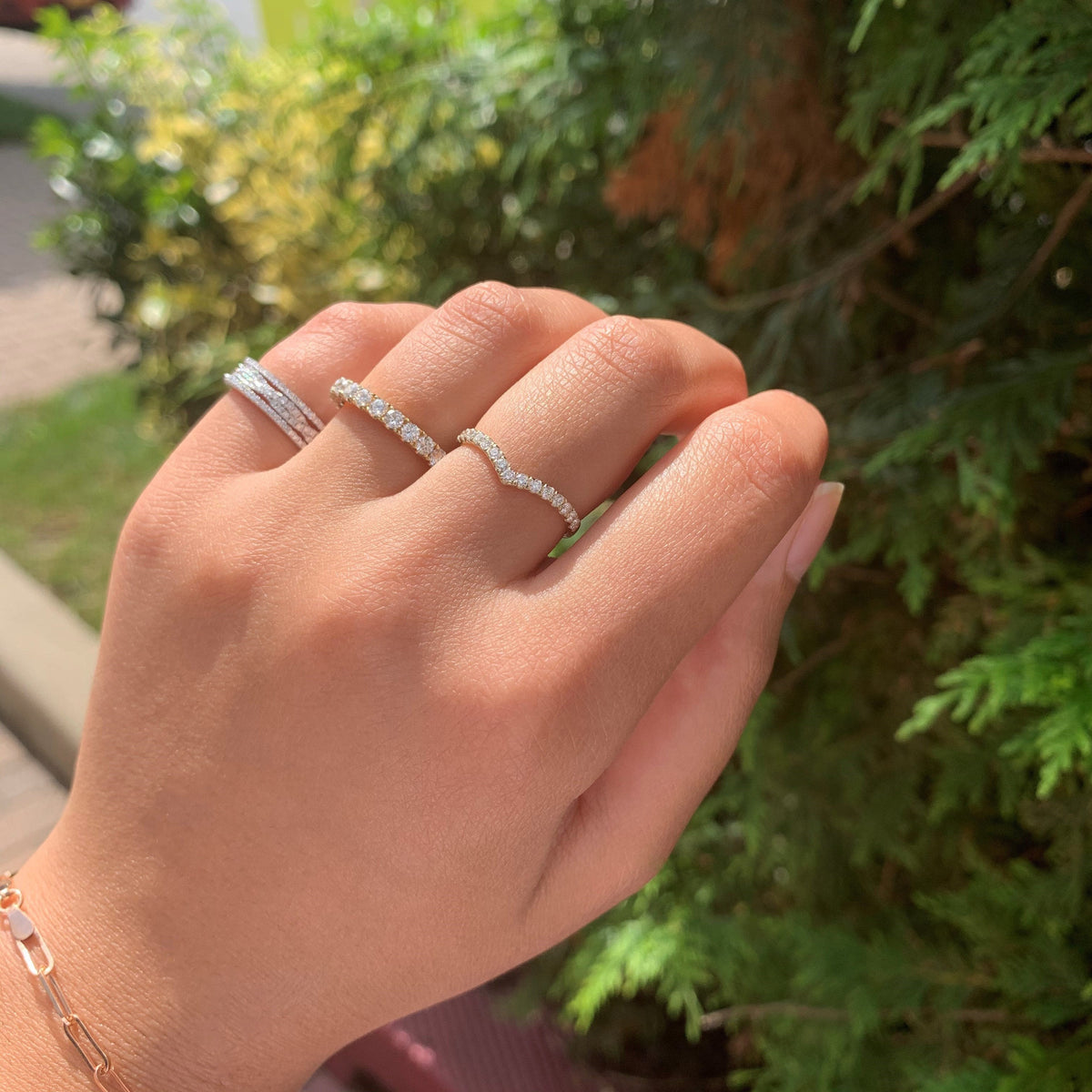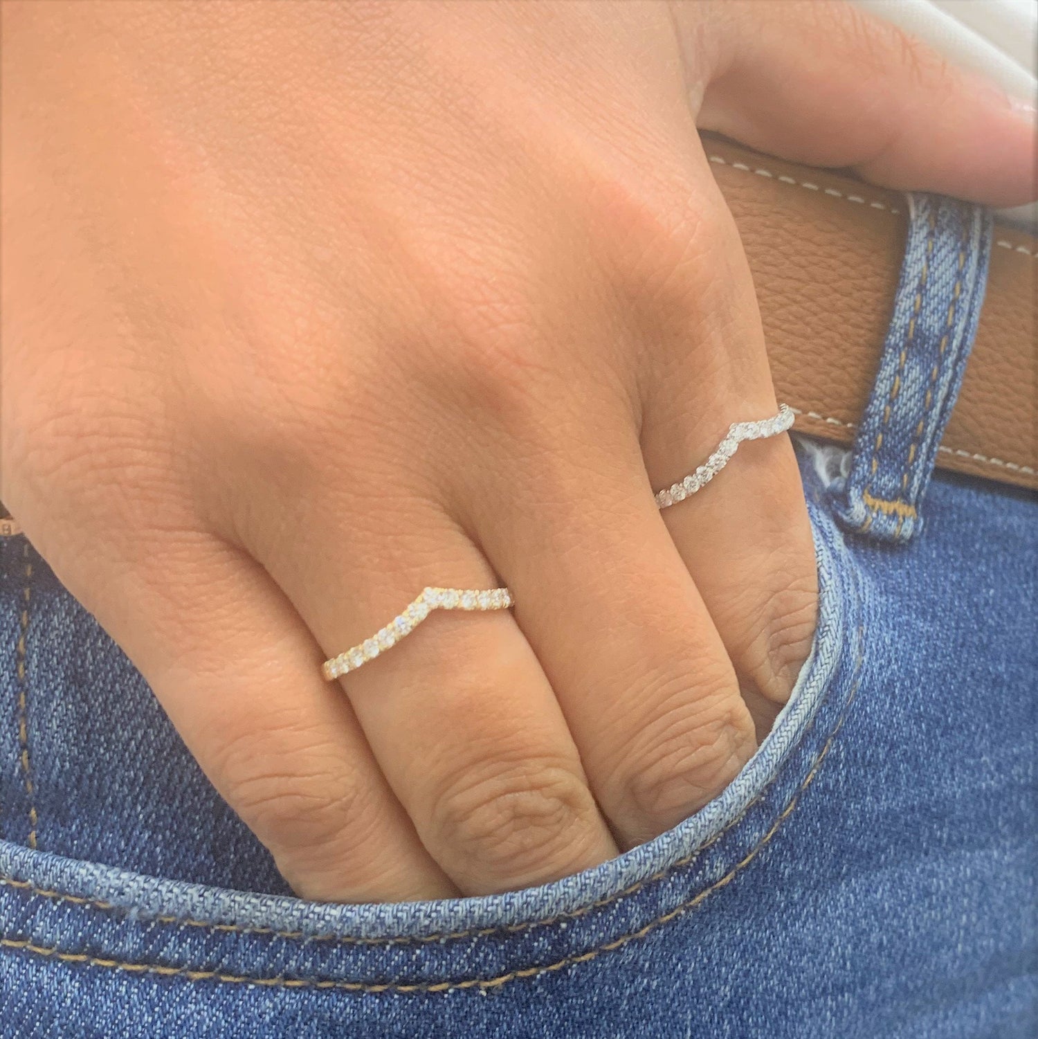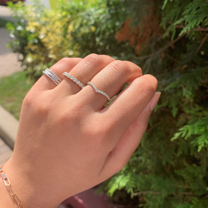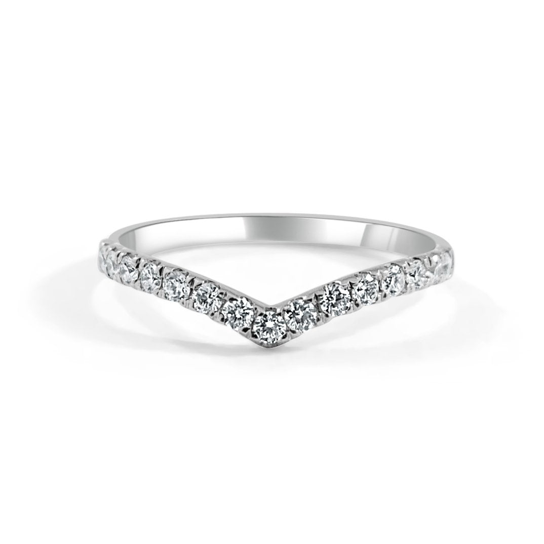 Made in 14K gold with a total diamond weight of 0.25 ct. Features a slim 1.8mm band for comfortable wear. Diamonds are set along the V shape for added brilliance.