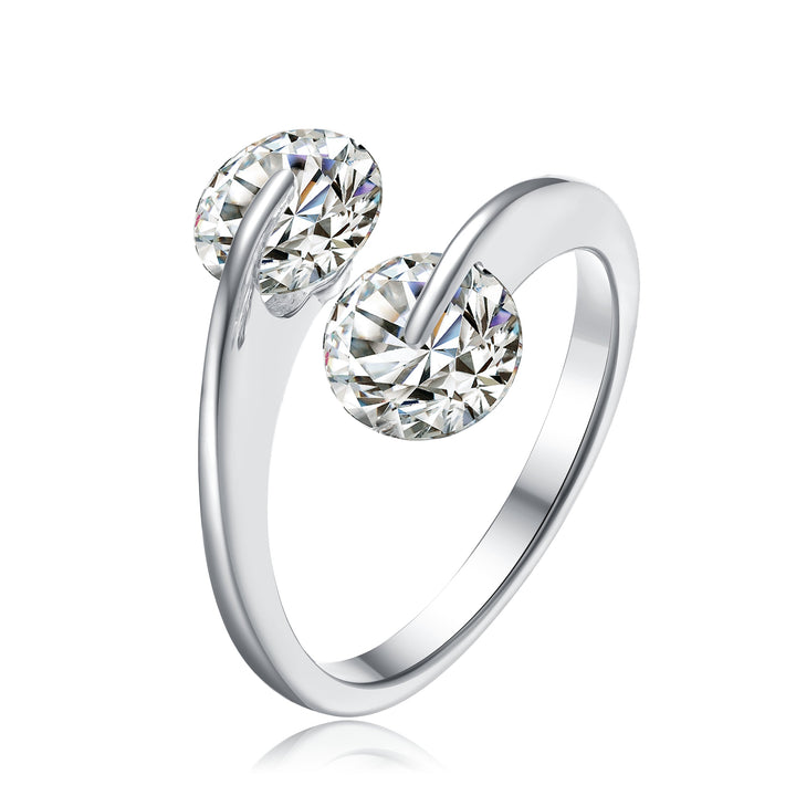 Crafted in sterling silver with rhodium plating. Features two large clear cubic zirconia stones. Available in sizes 6, 7, and 8.