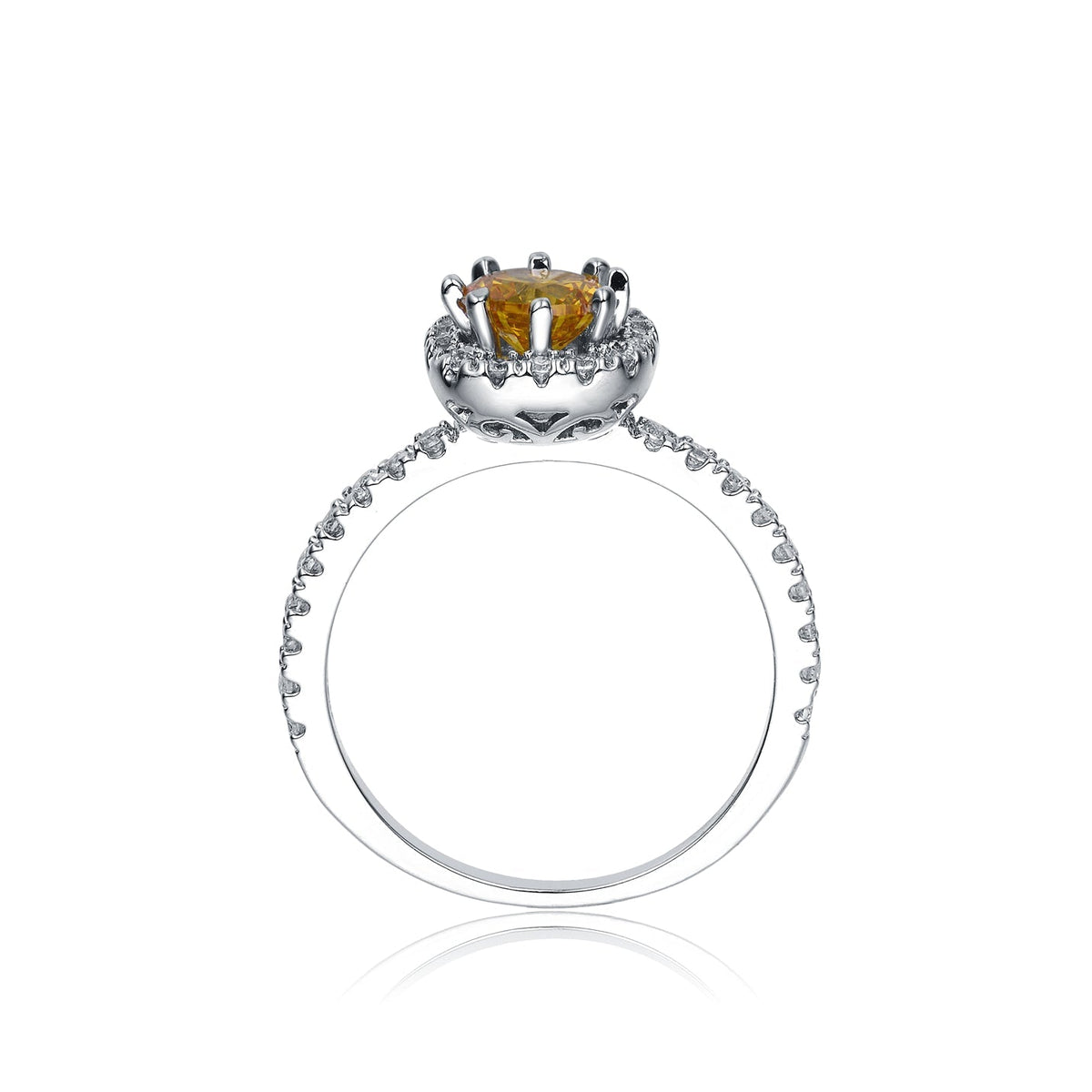 Crafted in sterling silver with rhodium plating. Features a round yellow cubic zirconia solitaire with clear cubic zirconia accents. Available in sizes 6, 7, and 8.