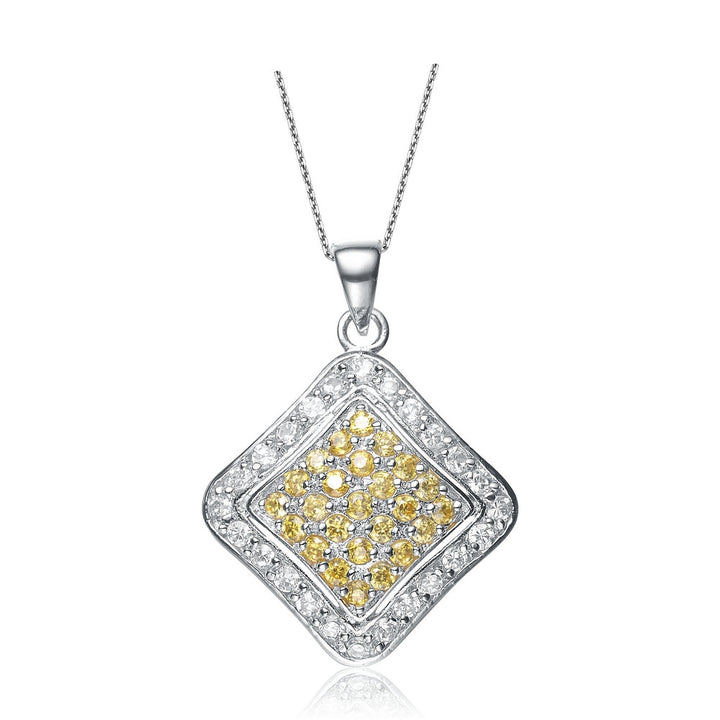 Crafted in sterling silver with rhodium and gold plating. Features a gold-plated diamond-shaped pendant with yellow cubic zirconia pave and a halo of clear cubic zirconia stones. Secured with a spring ring closure.