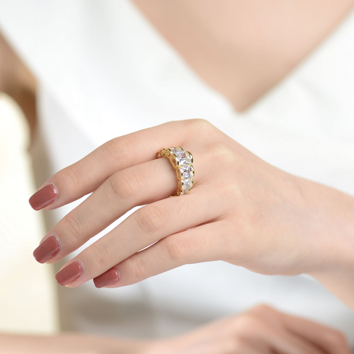 Crafted in sterling silver with gold plating. Features a radiant-cut clear cubic zirconia center stone with channel-set graduating clear radiant-cut cubic zirconia stones along the band. Available in sizes 6, 7, and 8.