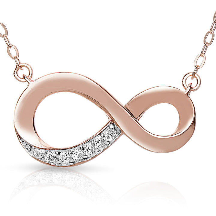 Crafted in sterling silver with rhodium and black plating. Features clear round cubic zirconia on one half of the infinity design and black round cubic zirconia on the other. Secured with a spring ring closure.