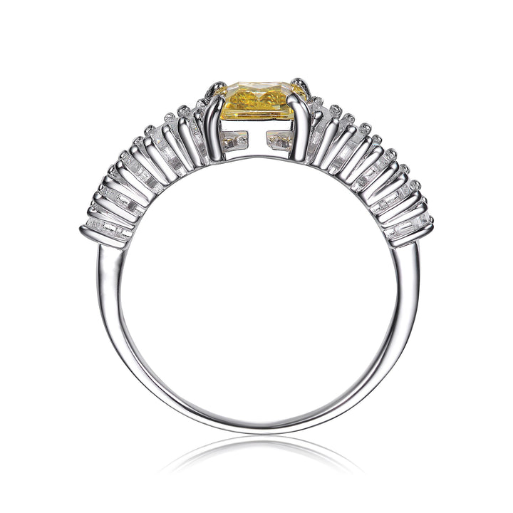 Crafted in sterling silver with rhodium plating. Features a yellow asscher-cut cubic zirconia center stone surrounded by a vertical cluster of clear baguette-cut cubic zirconia. Available in sizes 6, 7, and 8.