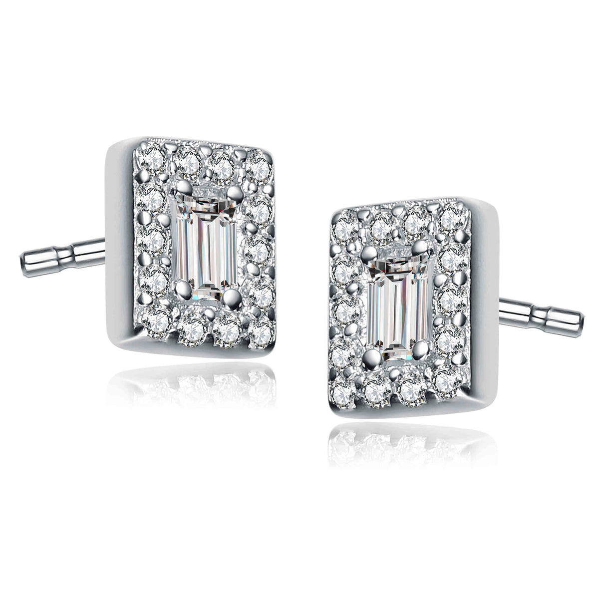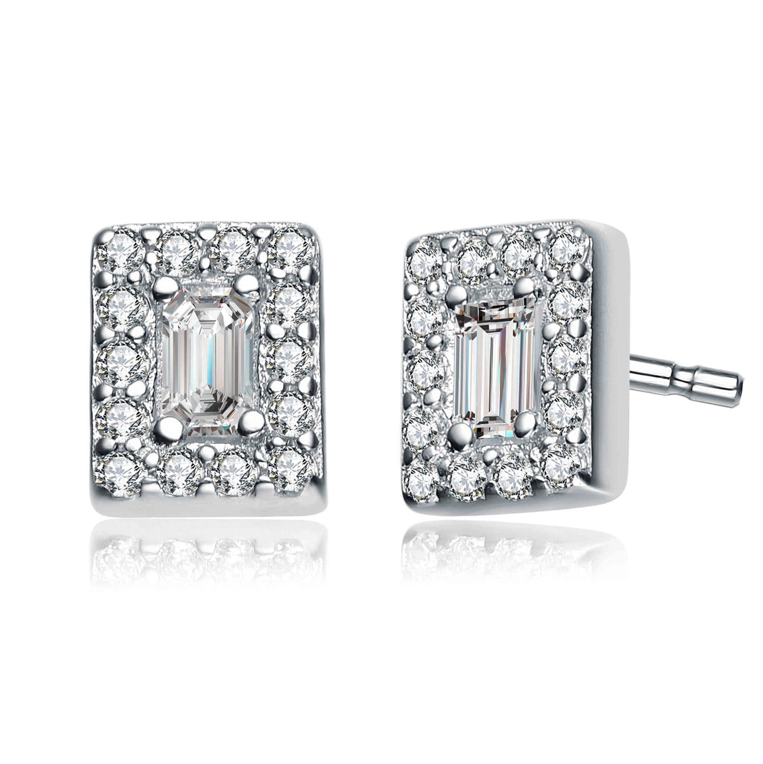 Crafted in sterling silver with rhodium plating. Features emerald-cut clear cubic zirconia center stones accented with small clear round cubic zirconia. Secured with butterfly clasps.