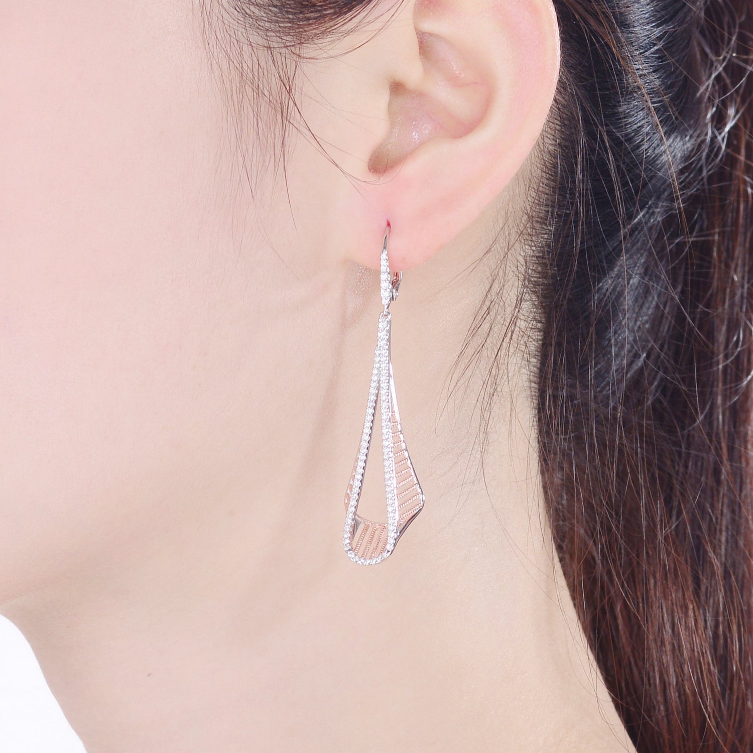 Crafted in sterling silver with rhodium and rose gold plating. Features wavy rose gold-plated grating elements with small clear round cubic zirconia accents. Secured with leverback closures.