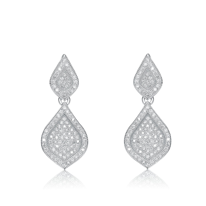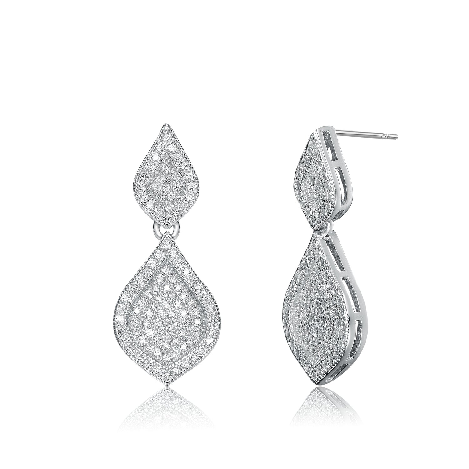 These Sterling Silver Cubic Zirconia Pear Drop Earrings by Genevive offer an elegant and delicate design. The pear-shaped cubic zirconia stones are enhanced with a pave setting of smaller clear round-cut stones, adding brilliance and sophistication. These earrings are perfect for formal events or adding a touch of elegance to any outfit.
