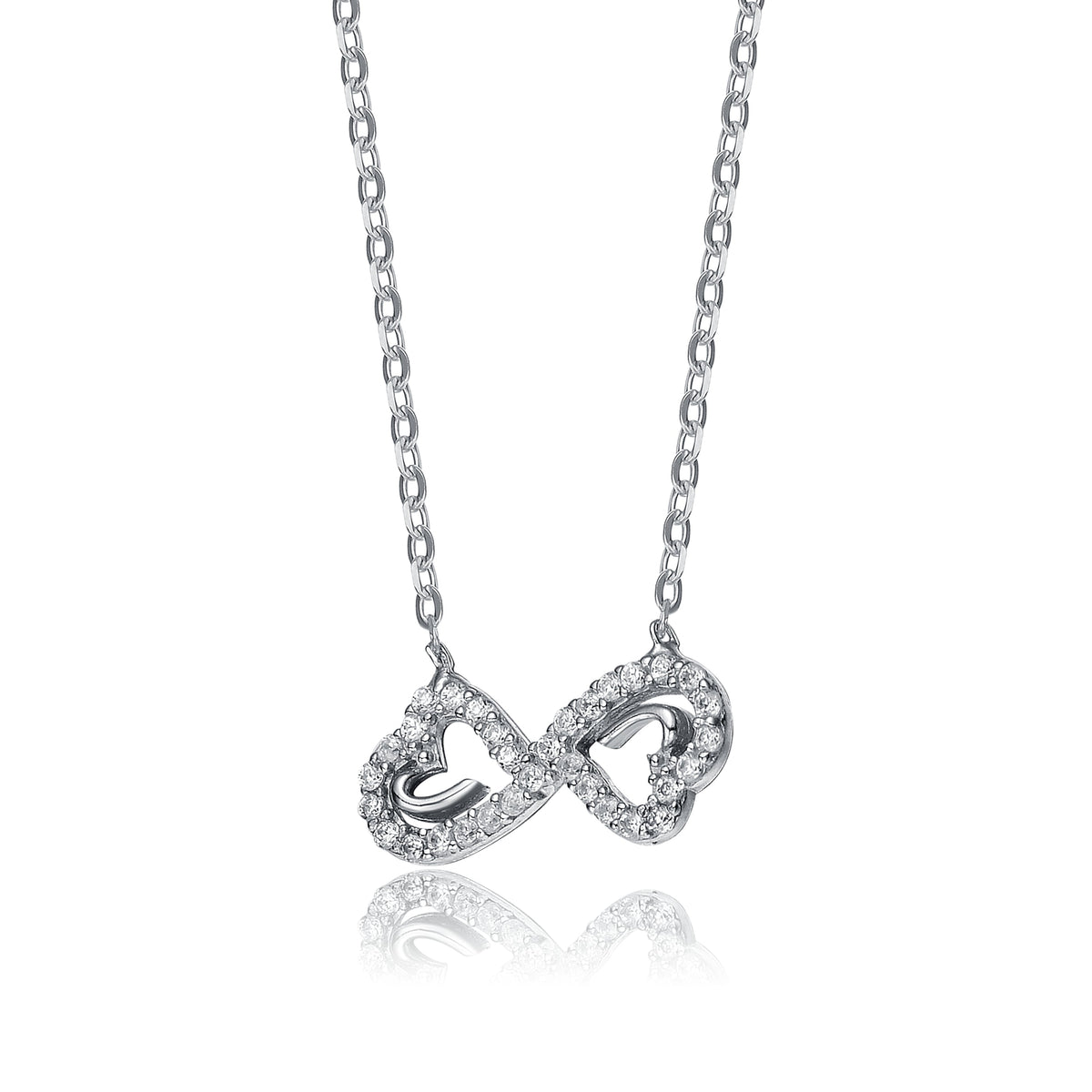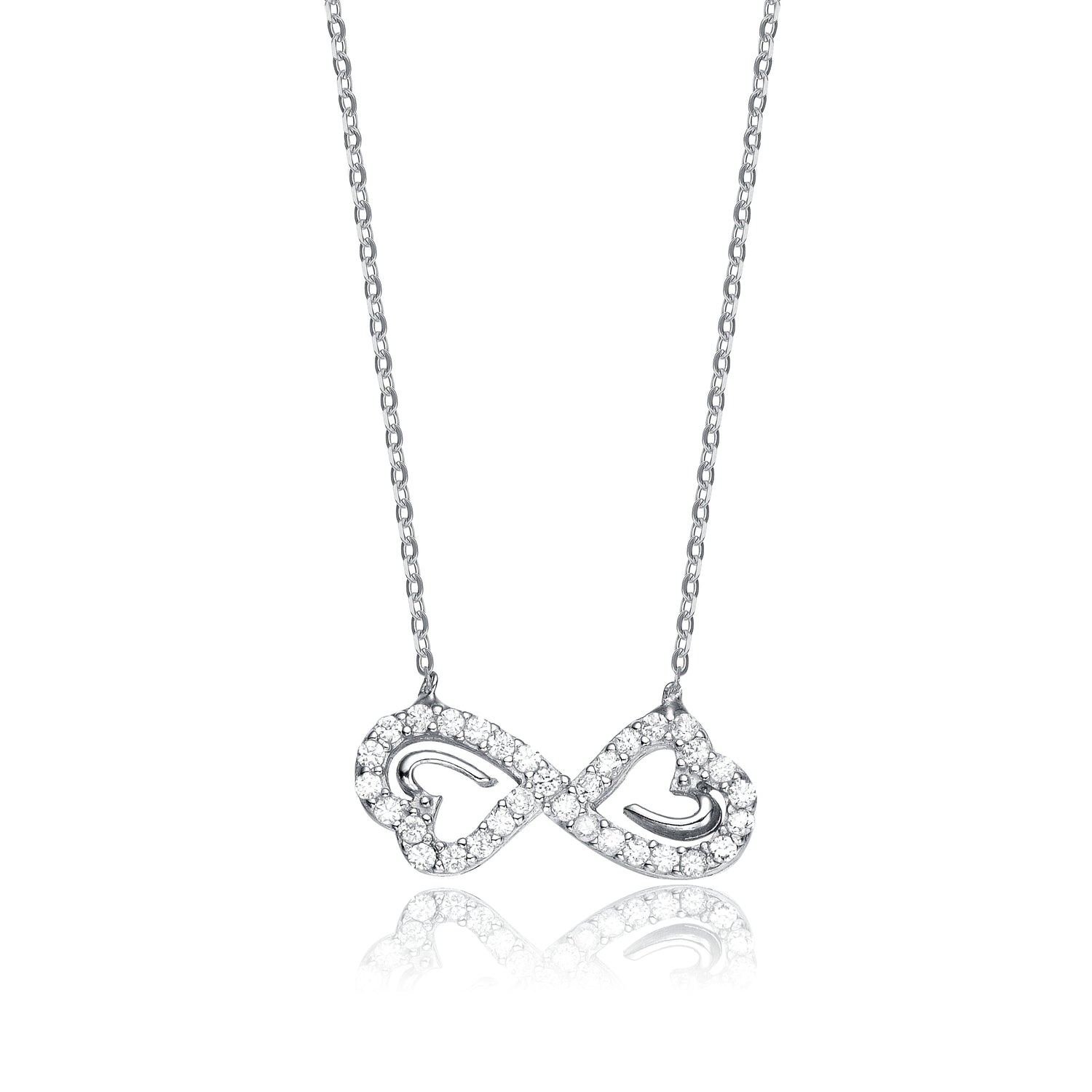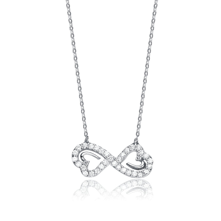 Crafted in sterling silver with rhodium plating. Features clear round-cut cubic zirconia in a double heart infinity design. Secured with a spring ring closure.