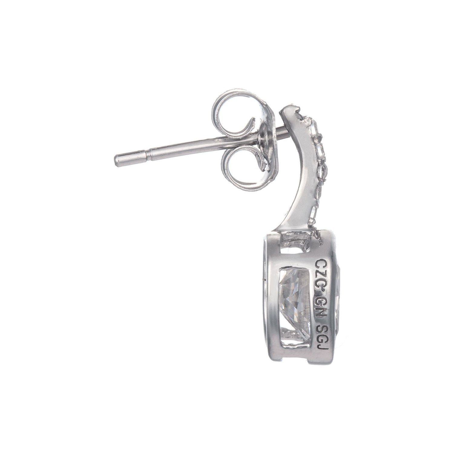 Crafted in sterling silver with rhodium plating. Features clear cubic zirconia stones in a square drop design. Secured with butterfly closures.