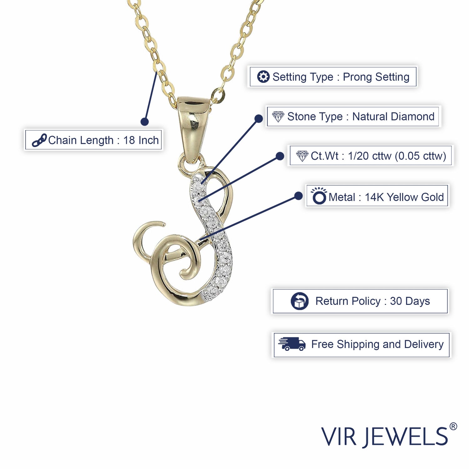 This 1/20 cttw Diamond Musical Pendant Necklace in 14K Yellow Gold by Vir Jewels celebrates the harmony of music with a beautiful design. The pendant is set with 10 sparkling diamonds, adding a delicate touch of sparkle to the musical shape. A perfect gift for a music lover, this necklace will bring a note of elegance to any outfit.