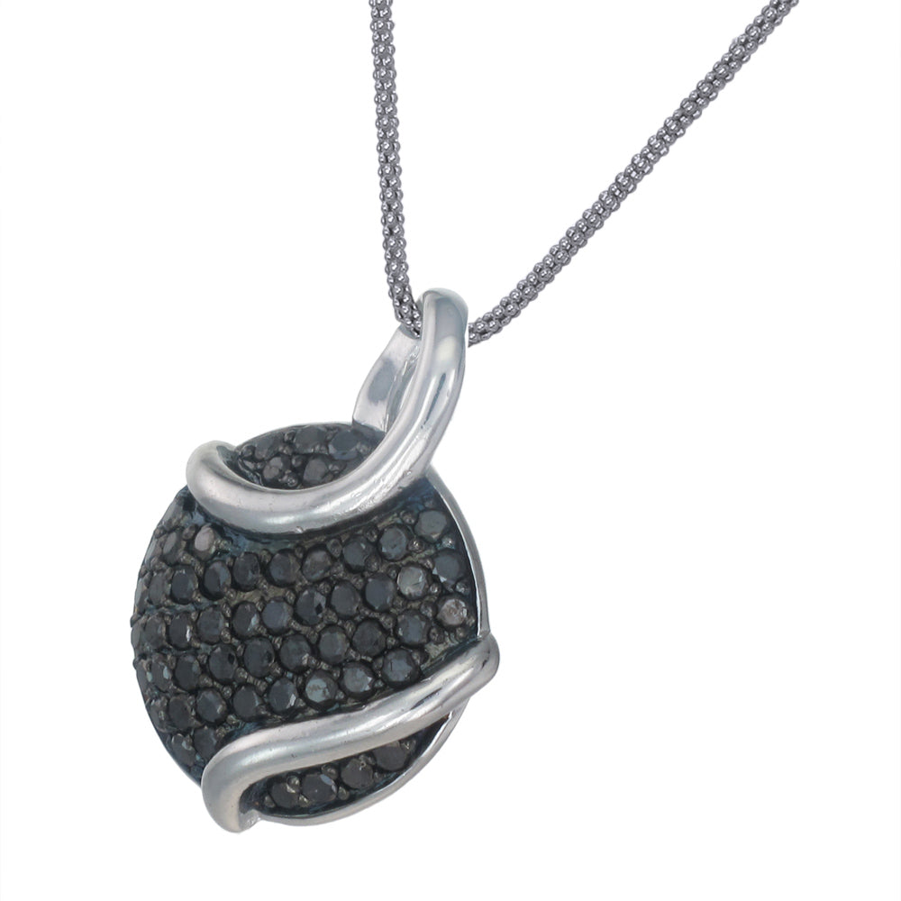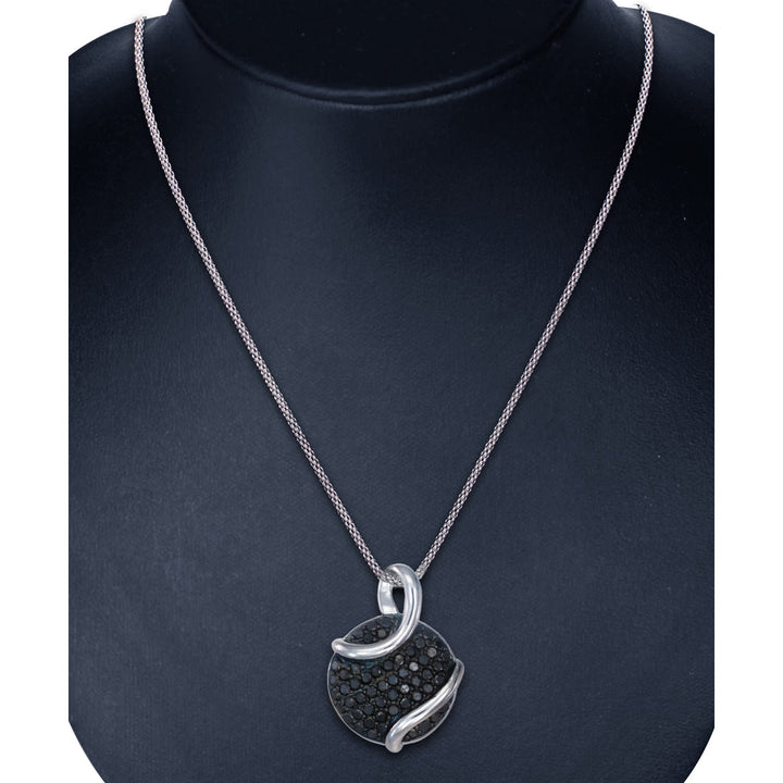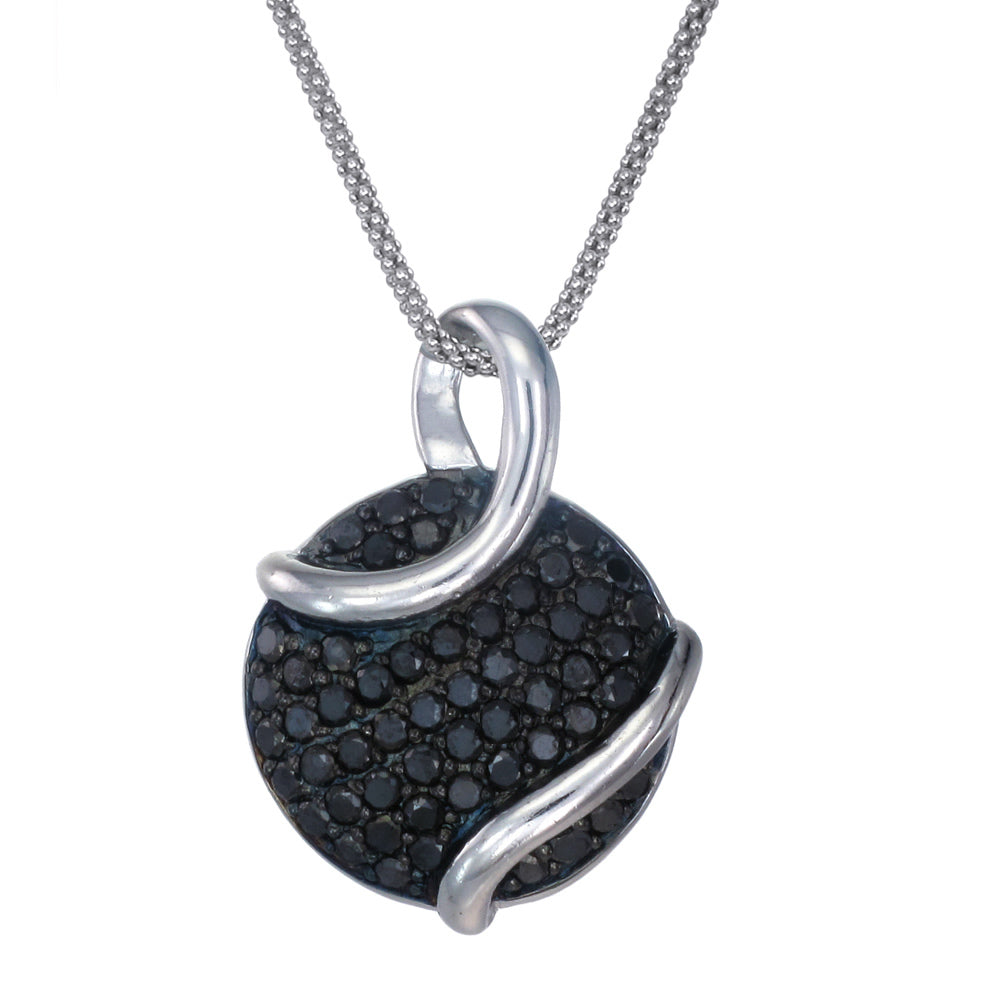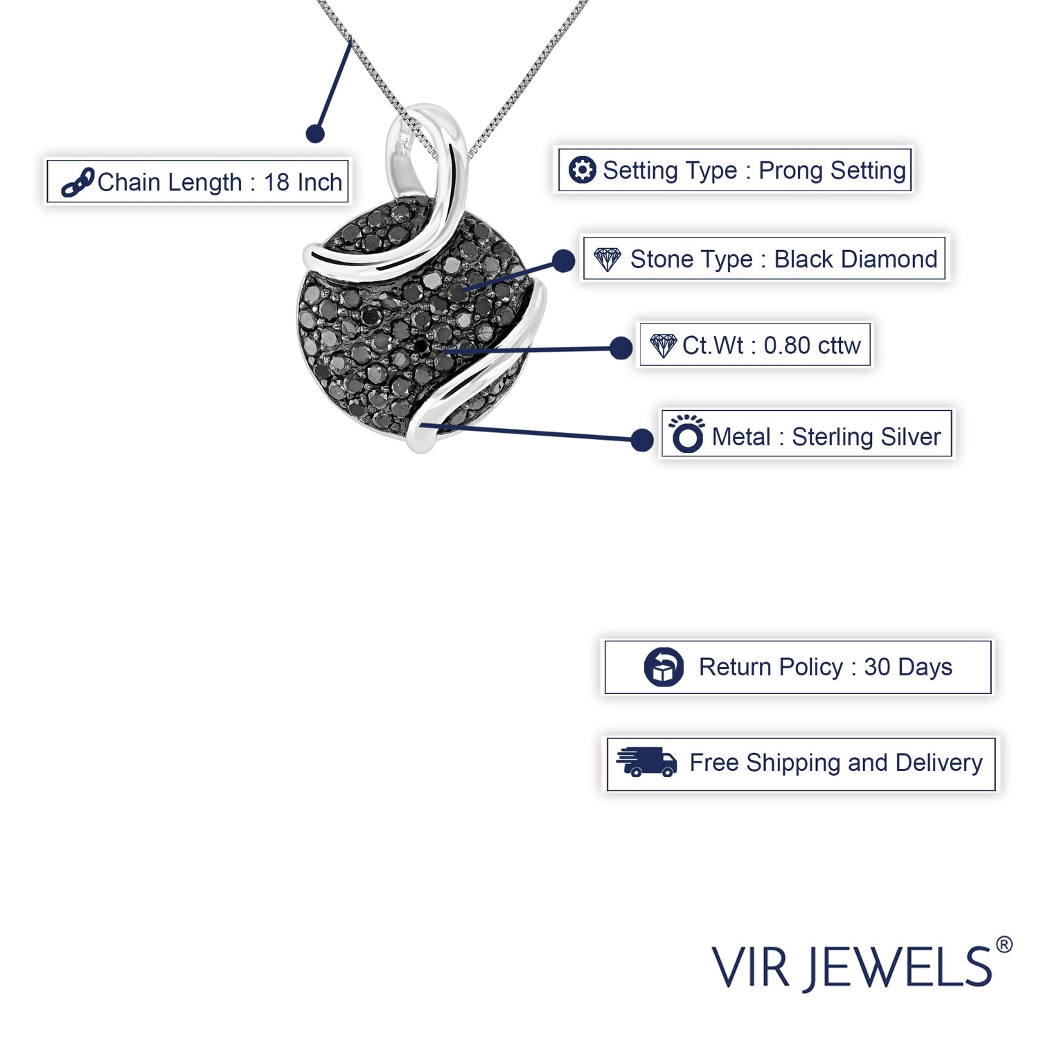 Crafted in .925 sterling silver with 0.80 cttw of natural round black diamonds (54 stones). The diamonds are heat-treated and have I1-I2 clarity. The pendant measures 20mm in length and 15mm in width. The necklace includes an 18-inch sterling silver chain.