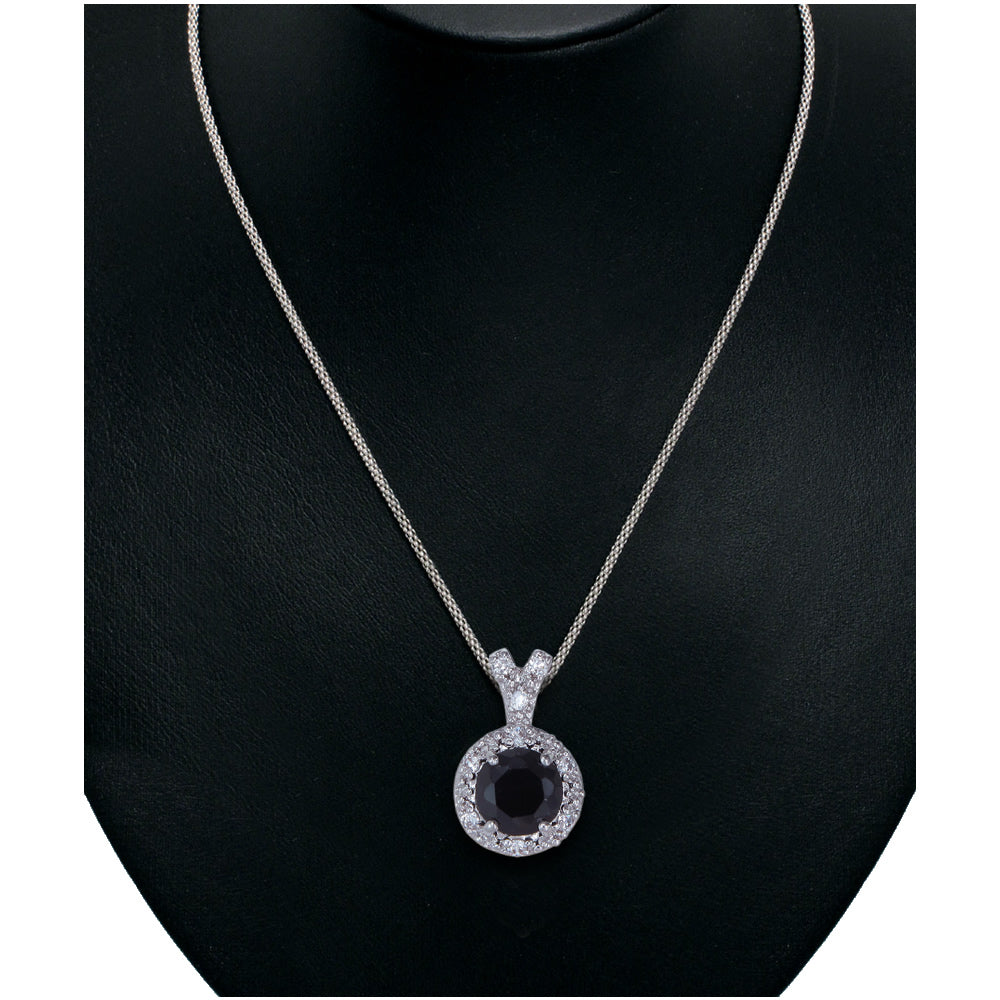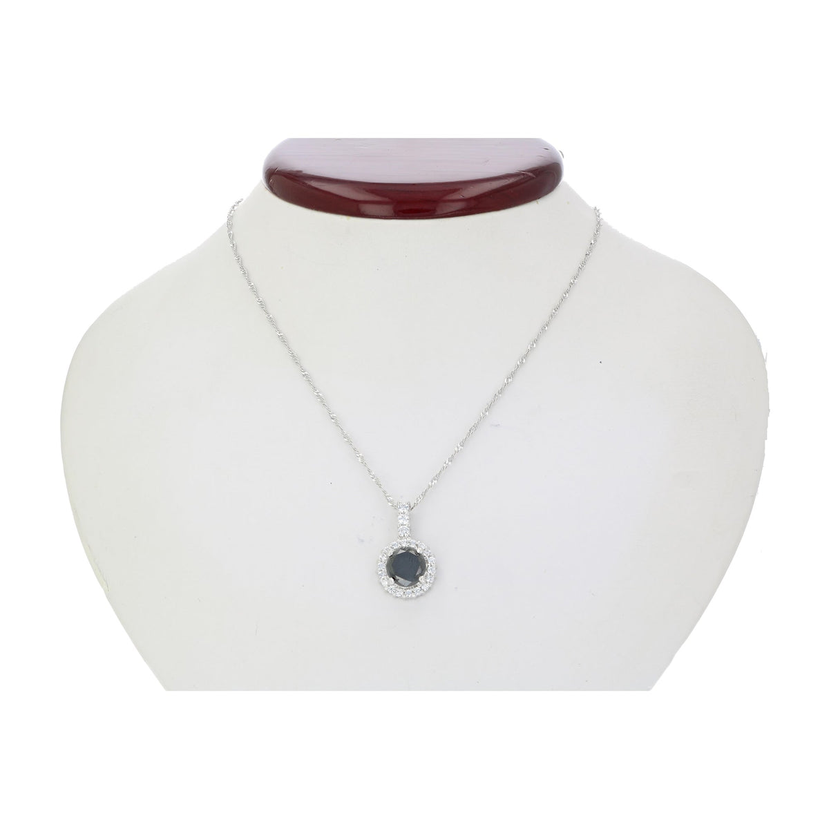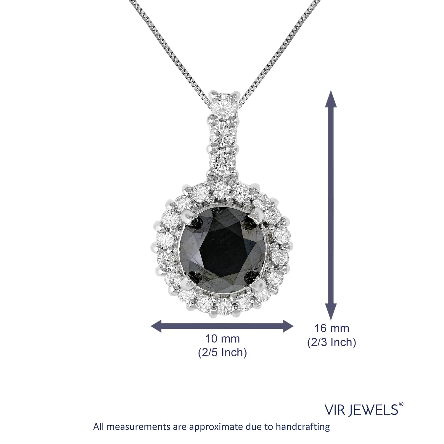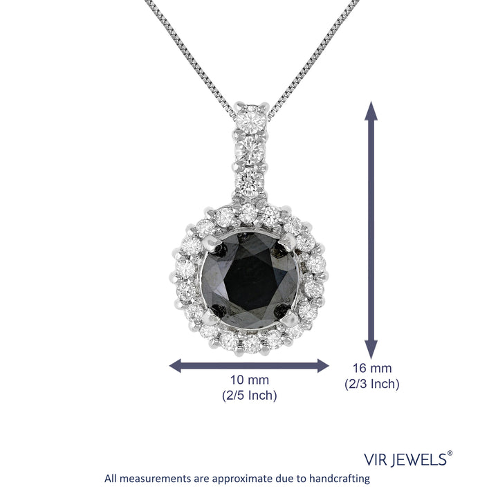 This 2 cttw Black and White Diamond Round Solitaire Pendant in .925 Sterling Silver by Vir Jewels is a stunning statement piece. The single round black diamond is surrounded by 21 cubic zirconia stones, creating a brilliant contrast. The 16mm length and 10mm width give the pendant a refined yet striking presence.