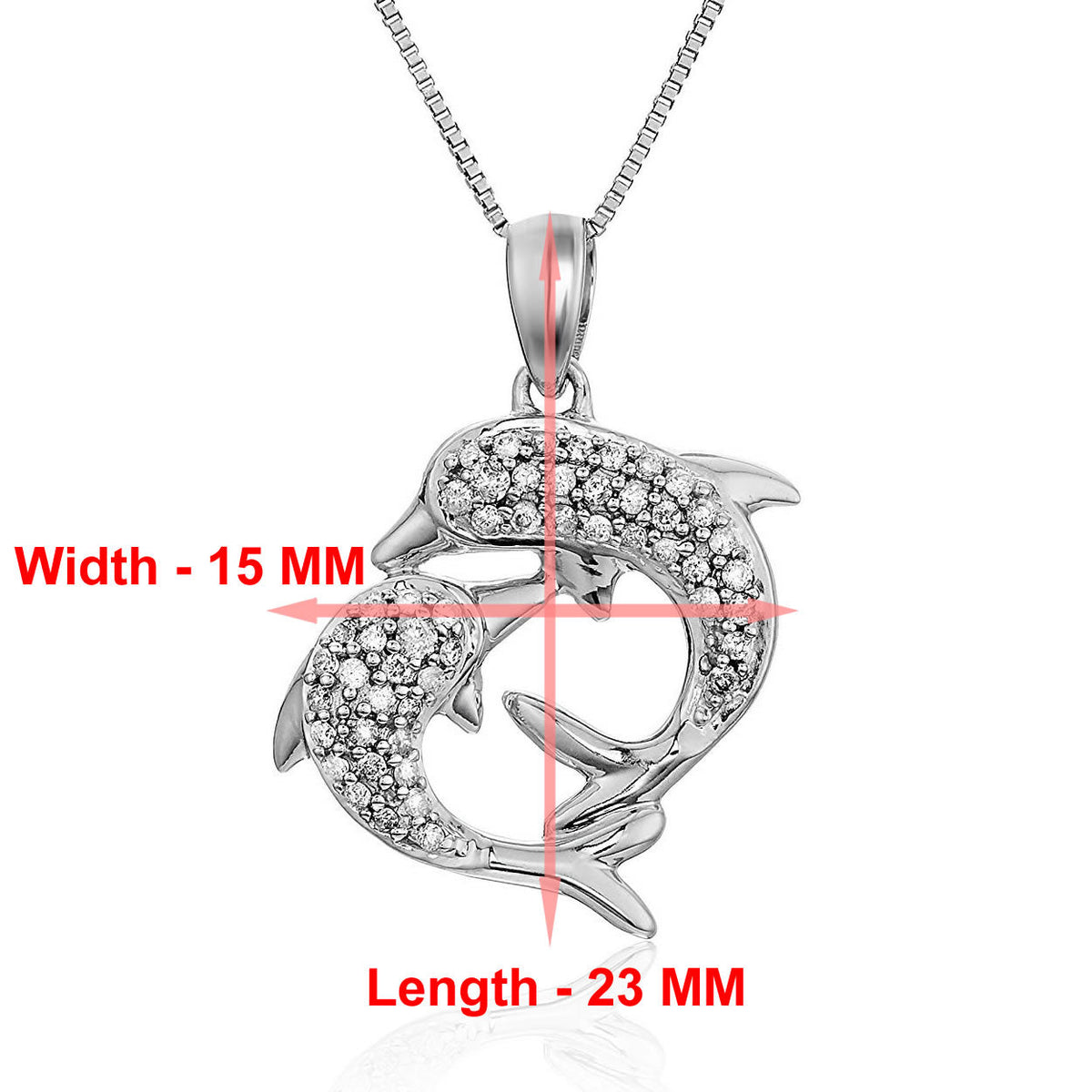 This 1/6 cttw Diamond Dolphin Pendant Necklace in 14K White Gold with 18-Inch Chain by Vir Jewels is a playful and elegant design. The 52 round diamonds, set in prong settings, create a shimmering dolphin shape, symbolizing freedom and grace. The pendant's dimensions of 15mm width and 23mm length make it a standout piece for any jewelry lover.