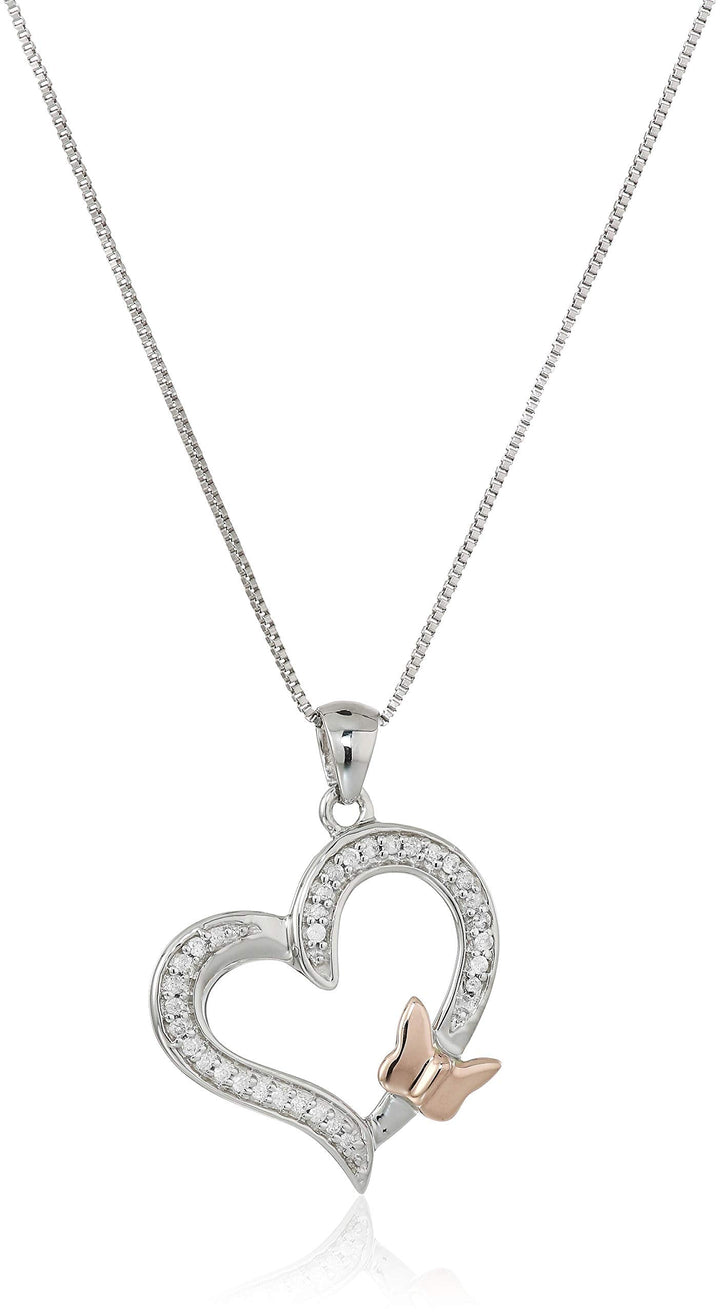 This 1/10 cttw Diamond Butterfly and Heart Pendant in 14K White and Rose Gold with Chain by Vir Jewels is a charming and playful piece. The 32 sparkling diamonds are prong-set in a delicate design, creating a butterfly and heart motif in 14K white and rose gold. With a pendant width and length of 17mm, it’s a lovely and romantic accessory.