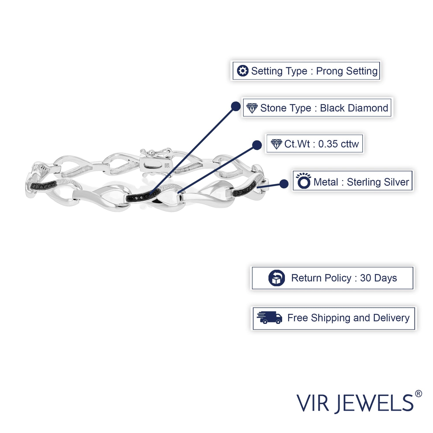This 0.35 cttw Black Diamond Infinity Tennis Bracelet in .925 Sterling Silver with Rhodium by Vir Jewels is a bold, elegant piece. The 36 round black diamonds, heat-treated for improved durability and appearance, are set in rhodium-plated sterling silver. With its 1/3 inch width and 7.50-inch length, this bracelet makes a striking addition to any collection.