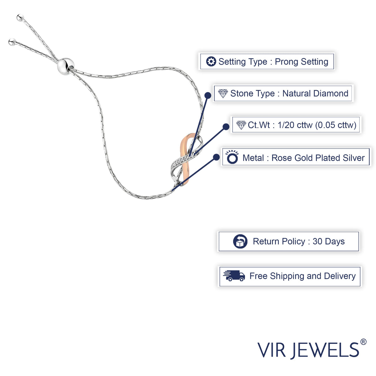This 1/20 cttw Diamond Bolo Bracelet in Rose Gold Plated Over Sterling Silver with Infinity Design by Vir Jewels offers a delicate yet stunning design. The 6 prong-set diamonds shine against the rose gold-plated sterling silver, making it a perfect accessory for any outfit. The adjustable sliding clasp ensures a custom fit.