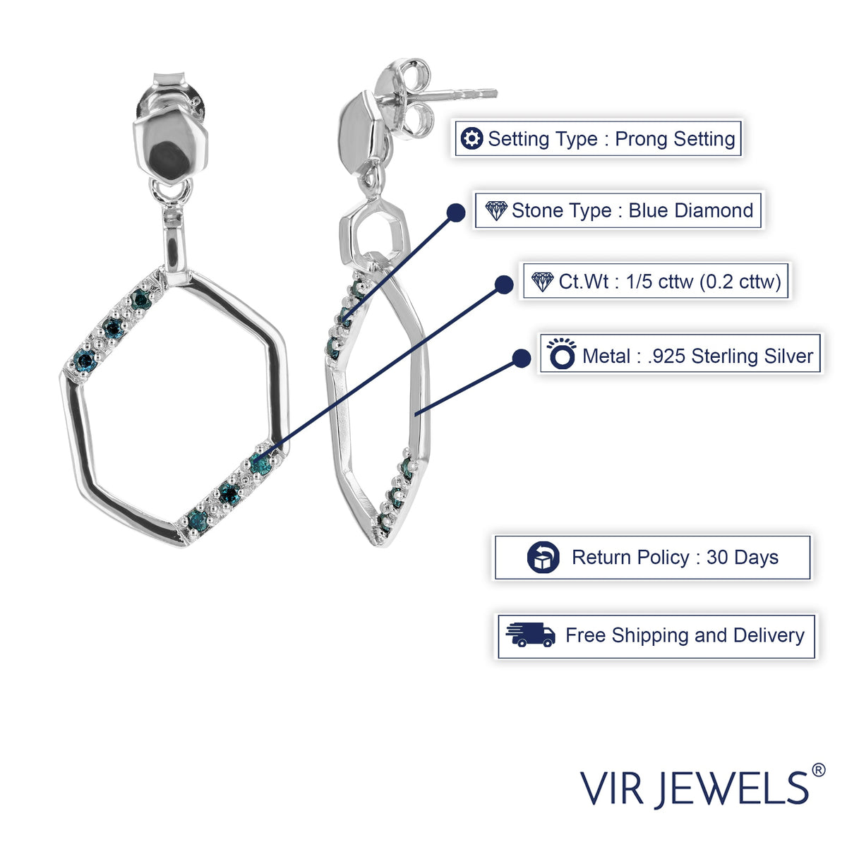 These Blue Diamond Dangle Earrings by Vir Jewels feature 1/5 cttw of natural blue diamonds that have been treated through irradiation to produce their striking color. Set in rhodium-plated .925 sterling silver, these earrings showcase 12 round-shaped blue diamonds, each radiating a vivid hue. With a width of 2/3 inch and height of 1 inch, these dangle earrings offer a modern and elegant look. A gift box is included.