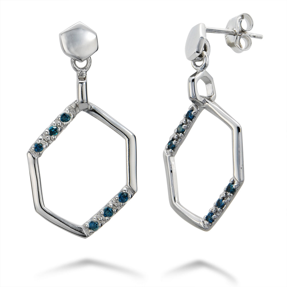 Handcrafted in .925 Sterling Silver with Rhodium plating, featuring 12 natural irradiated blue round diamonds (1/5 cttw). Width: 2/3 Inch, Height: 1 Inch. Diamond Clarity: I1-I2.