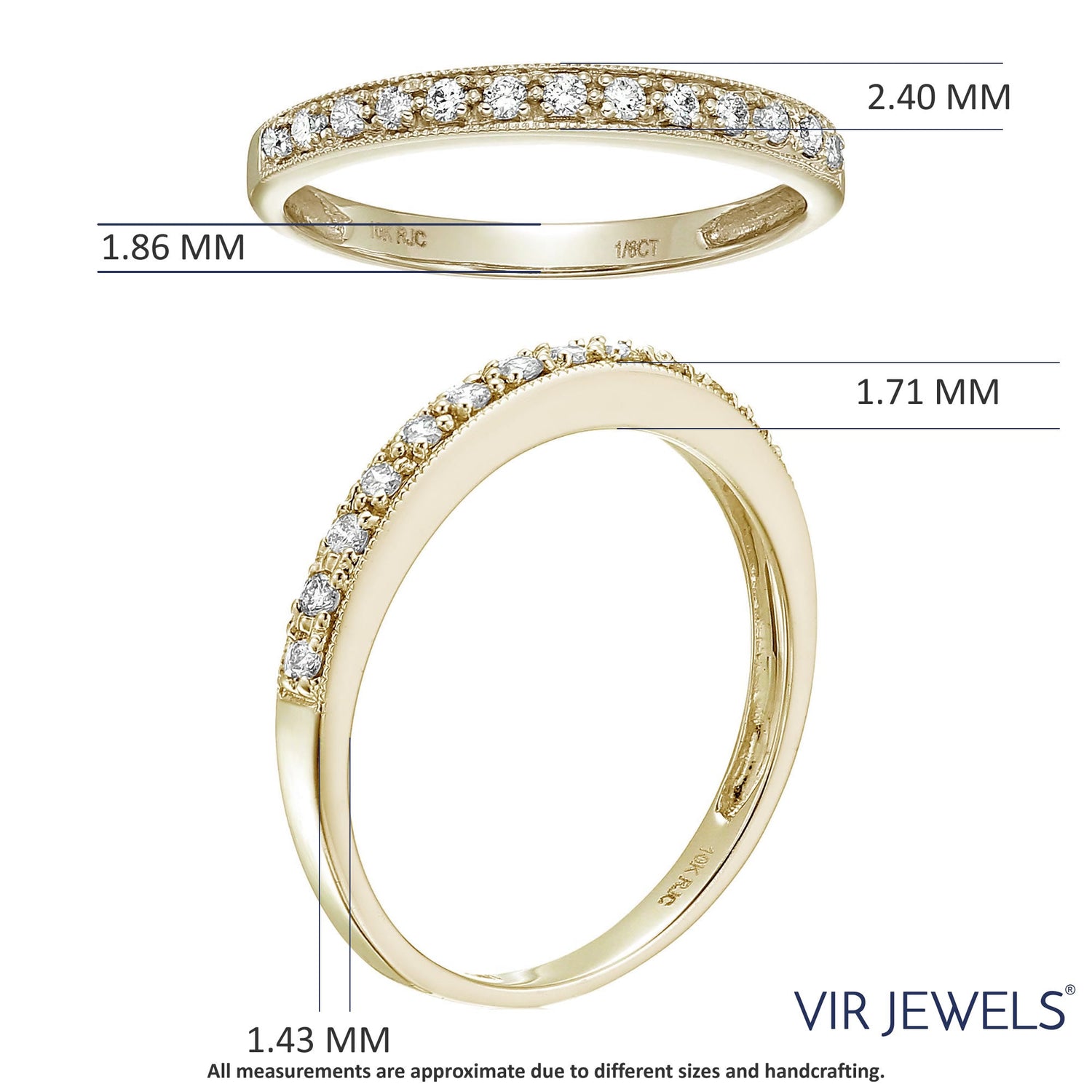 This Petite Diamond Wedding Band by Vir Jewels is the epitome of delicate elegance, with 1/6 cttw of natural diamonds set in a shared prong setting. Handcrafted in 10K white or yellow gold, this band features 12 to 14 round diamonds, depending on the size. The milgrain detailing adds a vintage-inspired touch to this modern wedding band, making it perfect for stacking or wearing alone. Weighing only 1.2 grams, it is available in multiple sizes. A gift box is included.