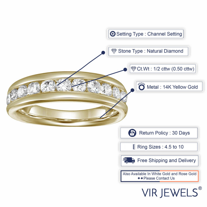 The Comfort Fit Diamond Wedding Band by Vir Jewels combines timeless elegance with a comfortable fit. Featuring 1/2 cttw of natural diamonds set in a channel setting, this wedding band is crafted in 14K white or yellow gold. With 11 sparkling round diamonds, it offers a sleek and sophisticated design that is perfect for everyday wear. Weighing 3 grams, it ensures durability and comfort. Available in multiple sizes, and comes with a gift box for added convenience.