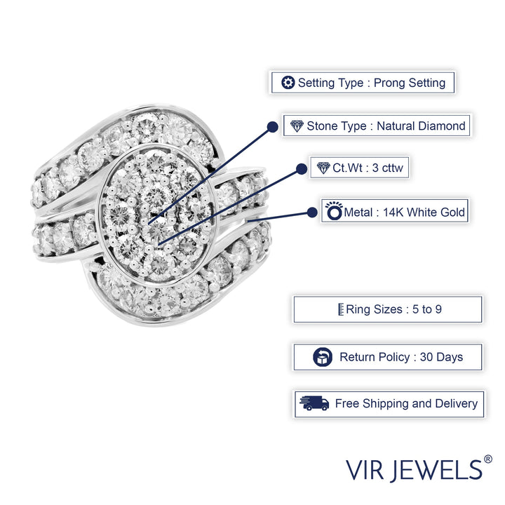 This Diamond Engagement Ring by Vir Jewels features a breathtaking 3 cttw of natural diamonds set in a prong setting. The oval shape and composite design make this piece timeless and sophisticated, with 34 sparkling diamonds creating a stunning visual effect. Crafted in 14K white gold, the ring weighs 4.4 grams and has a width of 4.5 mm and a length of 21 mm, making it a statement piece for engagements. A gift box is included.