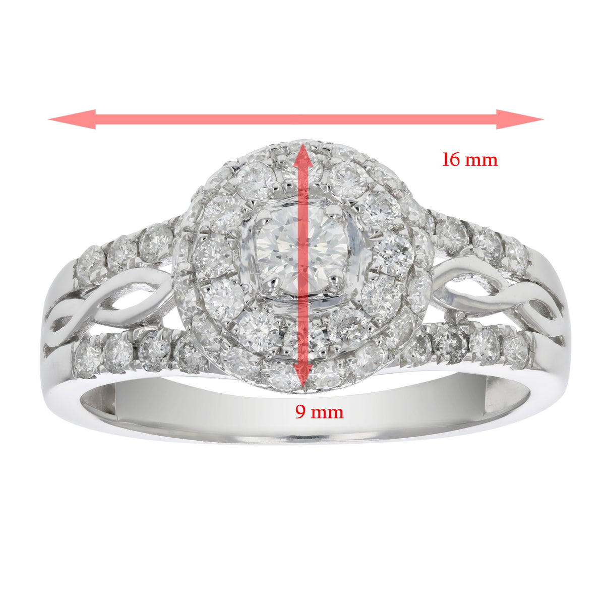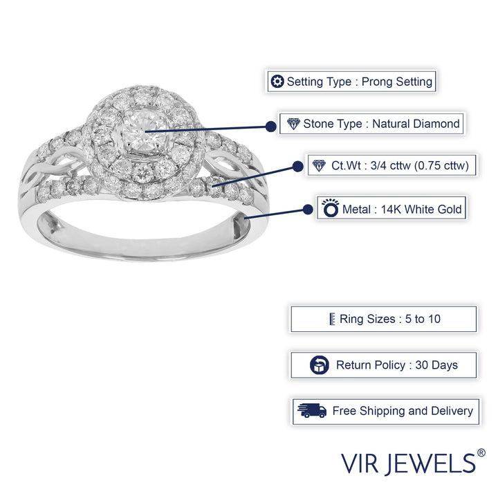 This Diamond Engagement Ring by Vir Jewels showcases 3/4 cttw of dazzling natural diamonds, set in 14K white gold. The center diamond weighs 0.09 cttw, and the side diamonds weigh 0.64 cttw, totaling 46 diamonds in this elegant design. With a width of 9 mm and a length of 16 mm, this ring exudes sophistication and luxury. Weighing 2.4 grams, it is available in multiple sizes, and a gift box is included.