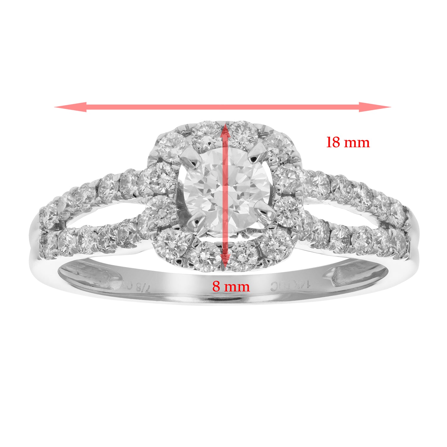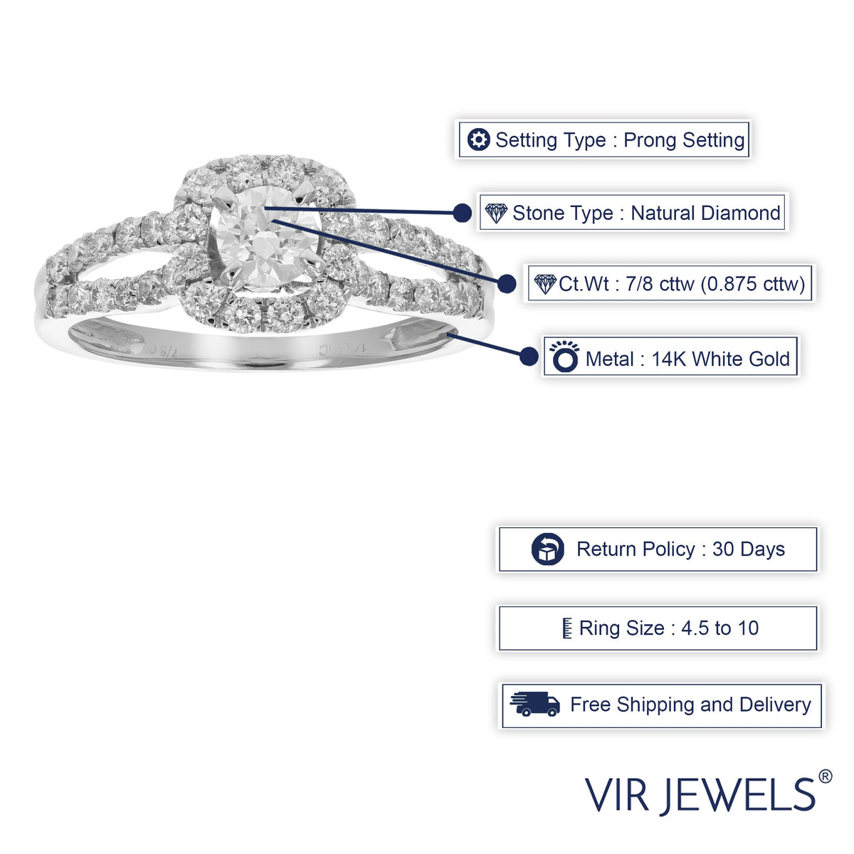 This Diamond Engagement Ring by Vir Jewels is a classic symbol of love and commitment, featuring 7/8 cttw of natural diamonds. Set in 14K white gold, the ring boasts a 0.29 cttw center diamond surrounded by 0.58 cttw of side diamonds. The elegant prong setting enhances the sparkle of each stone, making this a timeless and sophisticated choice. With a width of 8 mm and a length of 18 mm, it is a truly captivating piece. Available in multiple sizes, and comes with a gift box.
