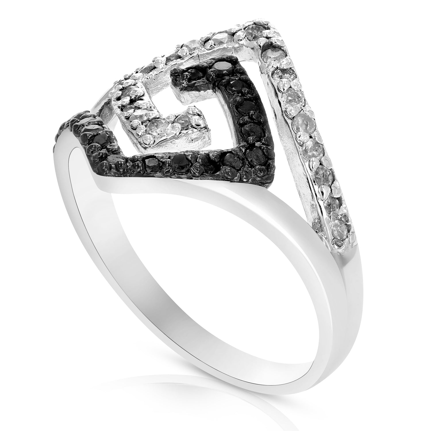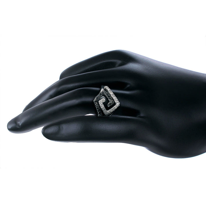 Handcrafted in .925 sterling silver with rhodium plating. Set with 19 black diamonds (heat-treated) and 19 white diamonds, totaling 0.45 cttw, in a prong setting. Ring width: 15 mm. Diamond clarity: I1-I2.