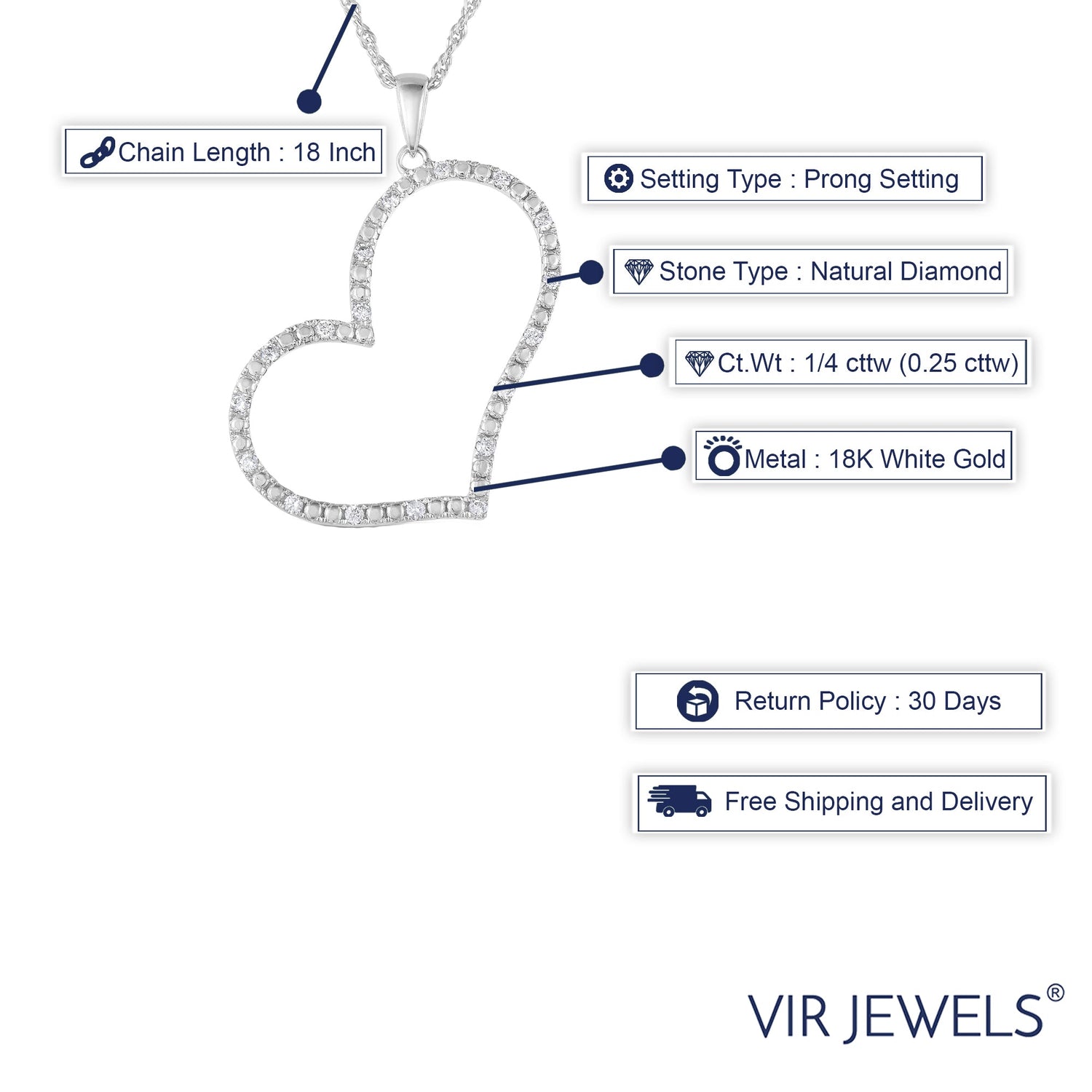 This Certified Diamond Heart Pendant Necklace by Vir Jewels is a timeless expression of love and elegance. Featuring 18 natural diamonds arranged in a graceful heart shape, this 18K white gold pendant is a radiant and meaningful addition to any jewelry collection. A refined gift for special moments.