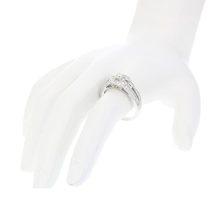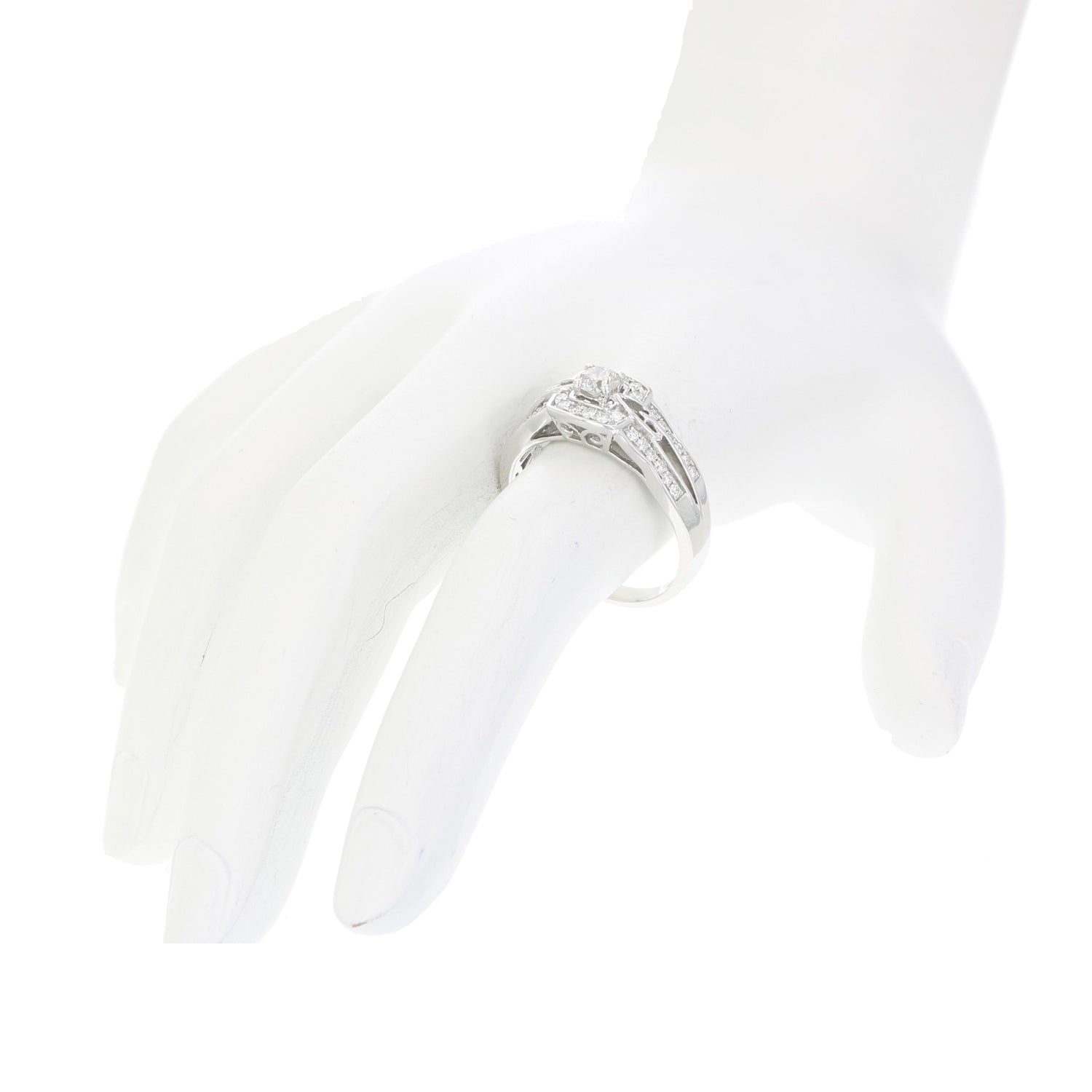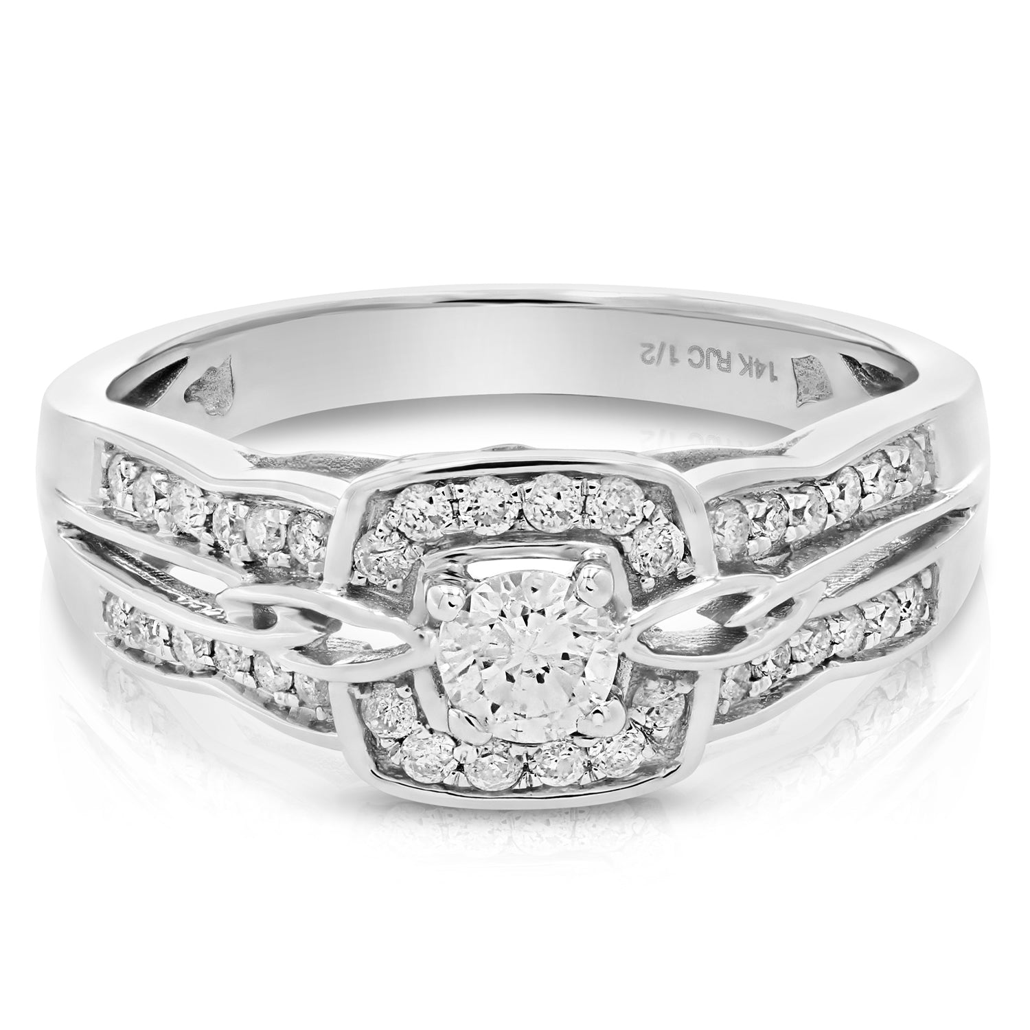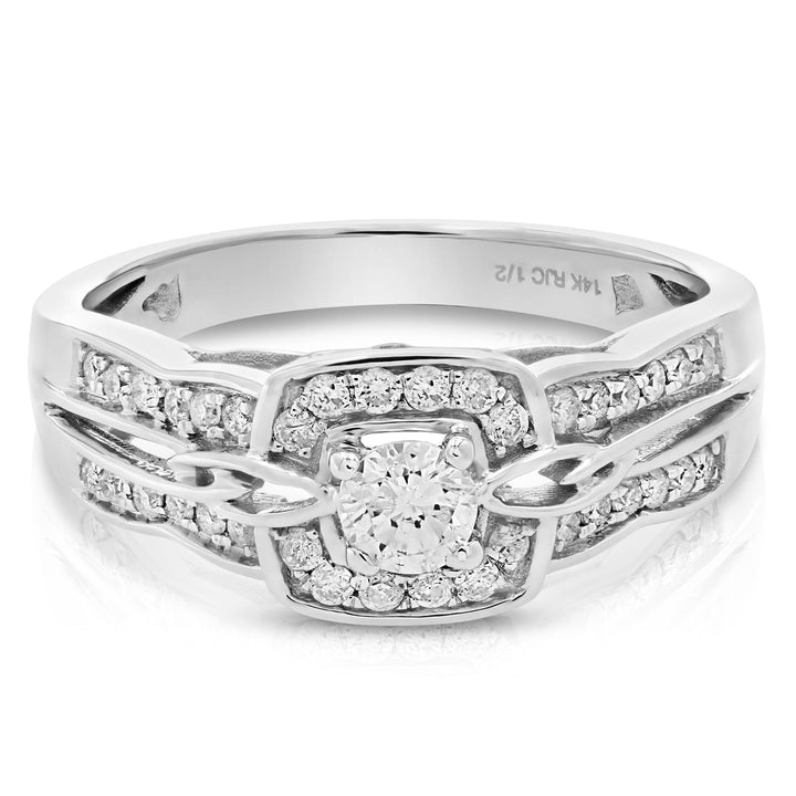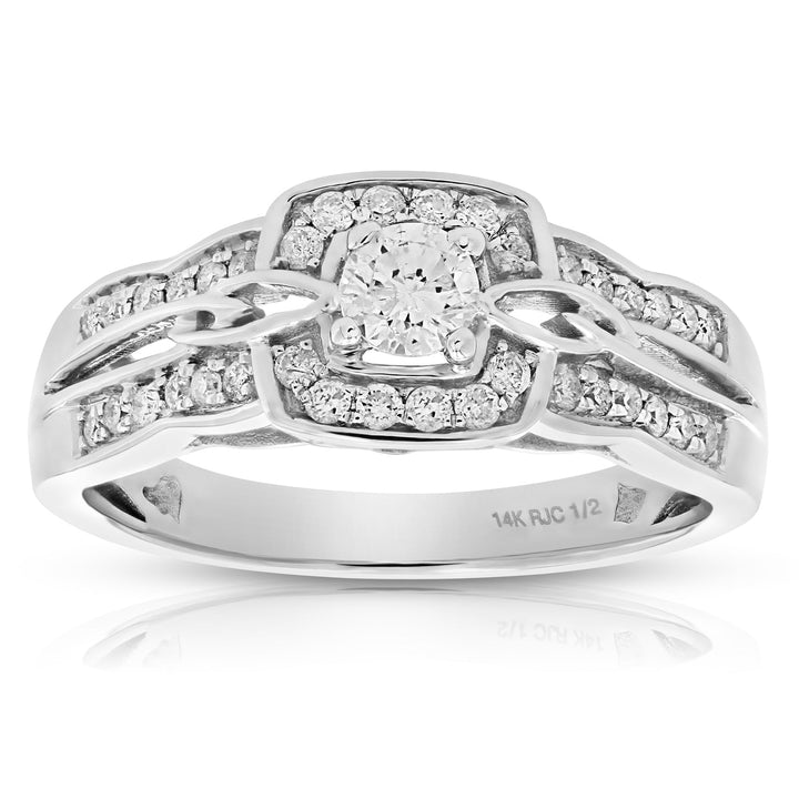 Handcrafted in 14K white gold. Set with 37 natural round diamonds, totaling 1/2 cttw (0.50 cttw). Center diamond: 0.24 cttw. Side diamonds: 0.26 cttw. Diamond clarity: I1-I2. Diamond color: J-K. Ring width: 8 mm. Ring length: 18 mm. Weight: 3.6 grams.