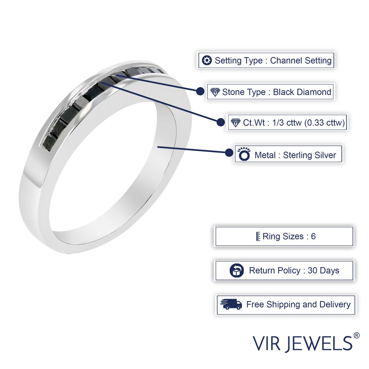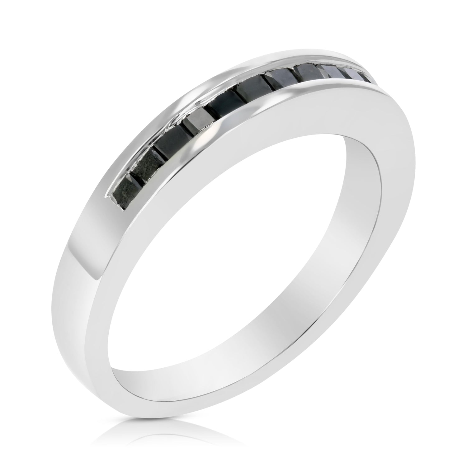 Handcrafted in .925 sterling silver with rhodium plating. Set with 11 natural princess-cut black diamonds (heat-treated), totaling 1/3 cttw (0.33 cttw). Diamond clarity: I1-I2. Band width: 3 mm.