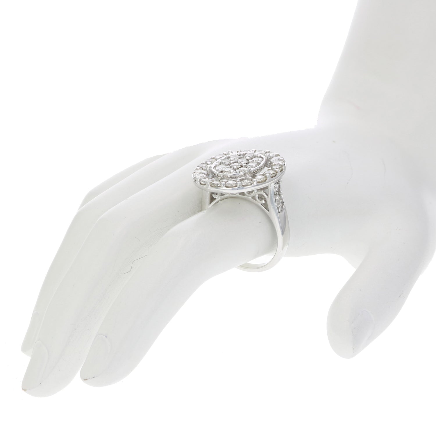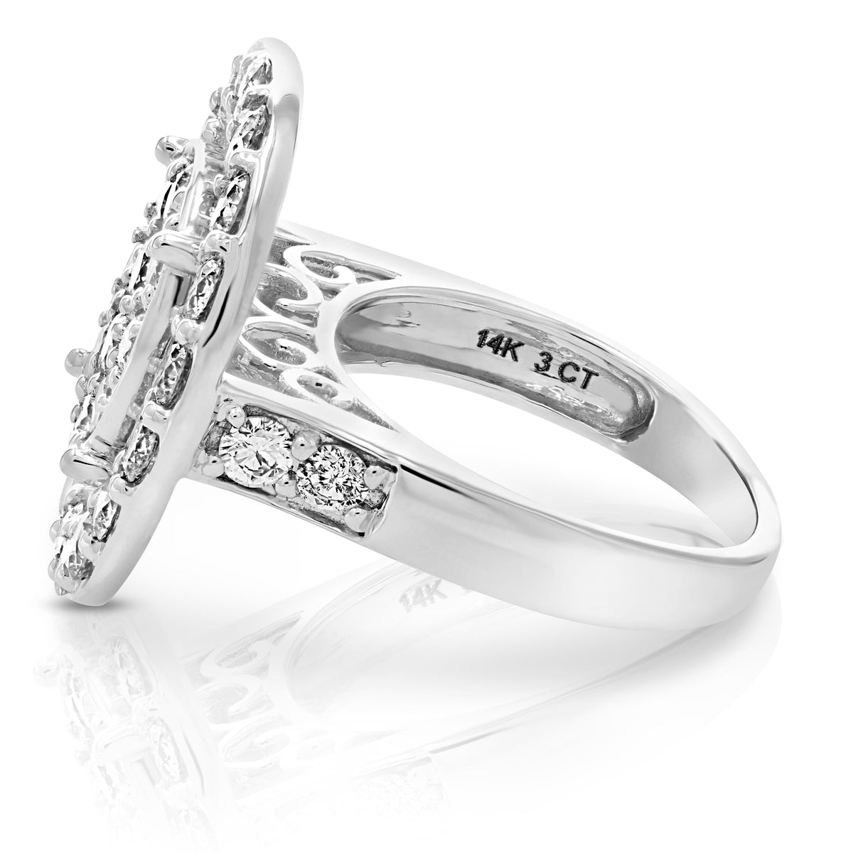 Handcrafted in 14K white gold. Set with 32 natural round diamonds, totaling 3 cttw. Diamond clarity: I1-I2. Diamond color: J-K. Ring width: 2.5 mm. Ring length: 19 mm. Weight: 3 grams.