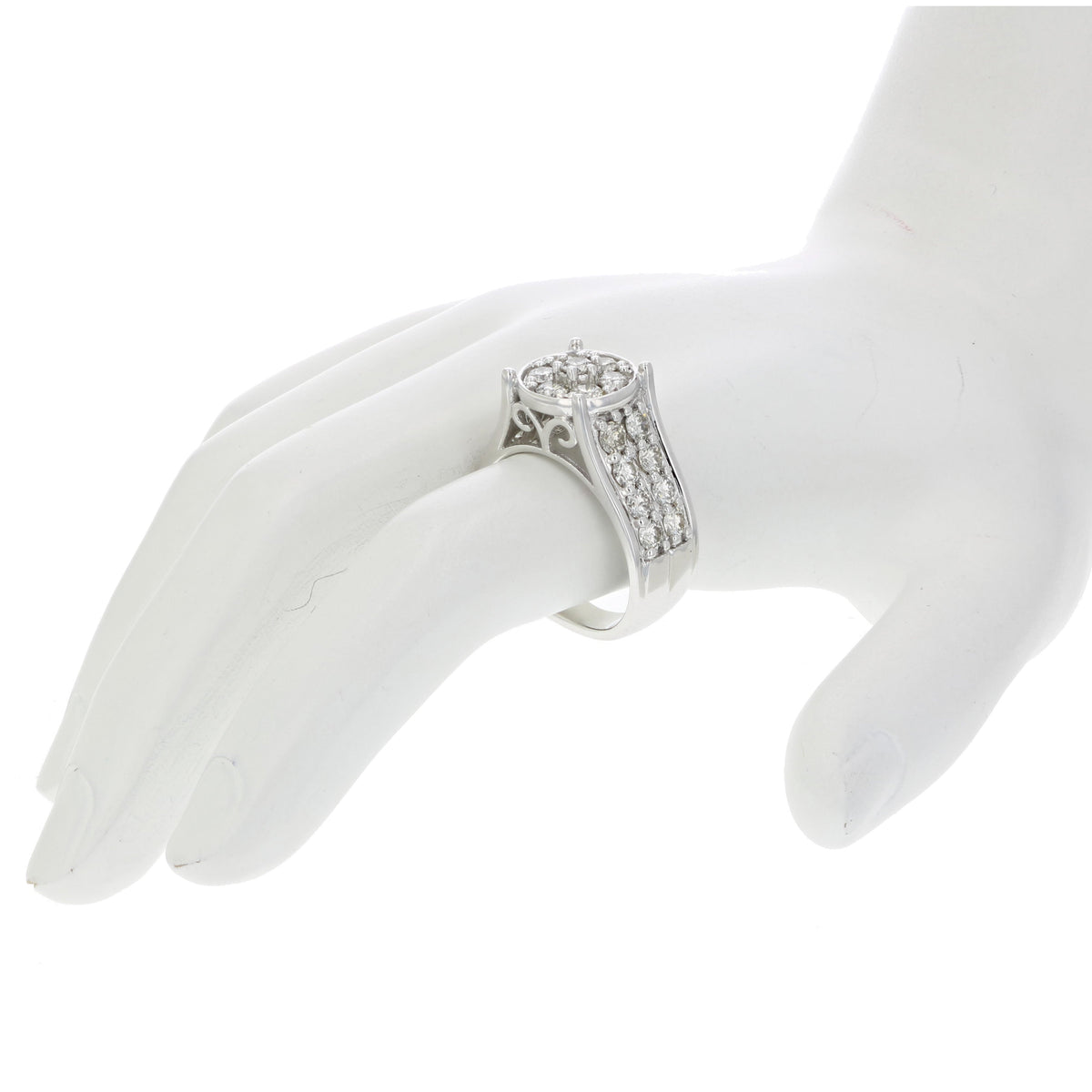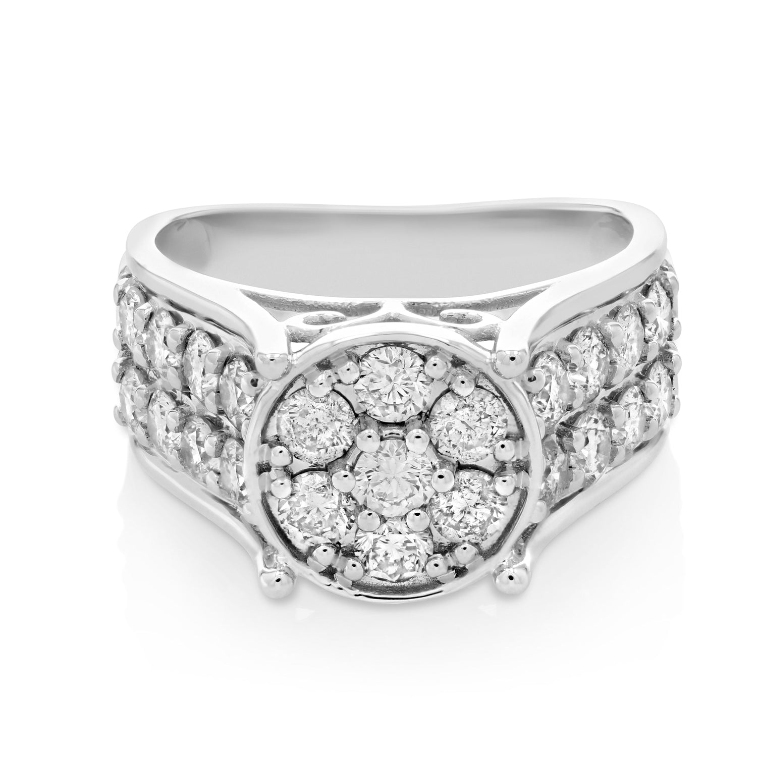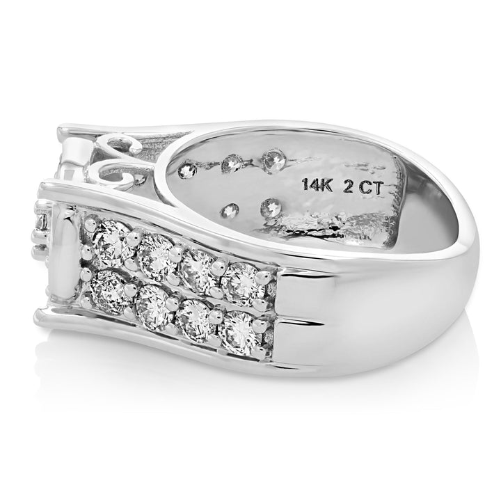 Handcrafted in 14K white gold. Set with 23 natural round diamonds, totaling 2 cttw. Diamond clarity: I1-I2. Diamond color: J-K. Ring width: 3.5 mm. Ring length: 21 mm. Weight: 3.2 grams.