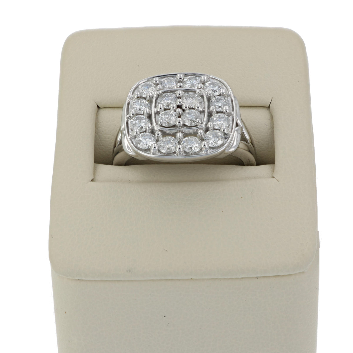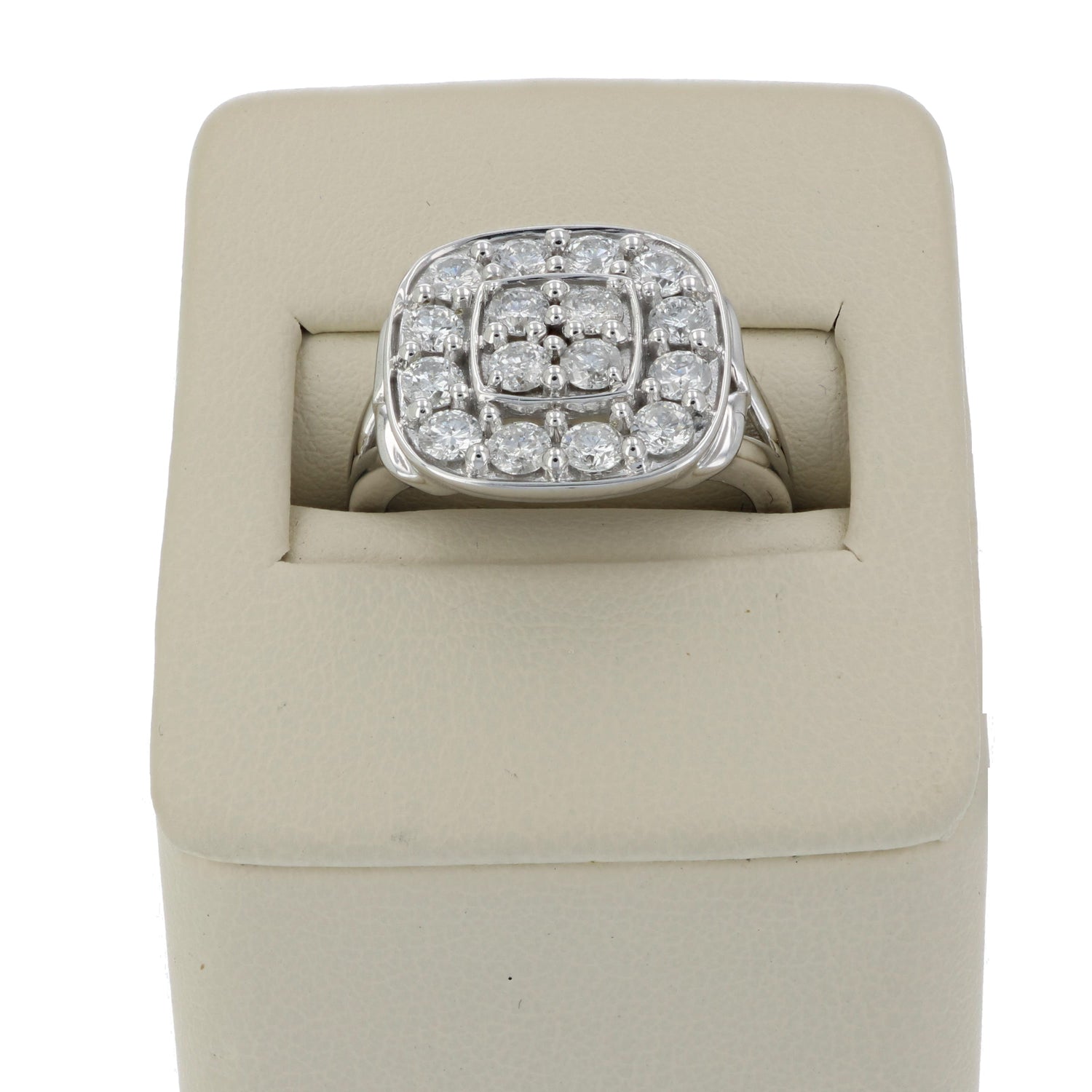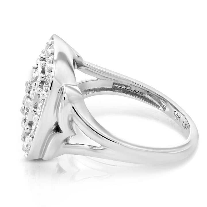 Handcrafted in 14K white gold. Set with 16 natural round diamonds, totaling 1.50 cttw. Diamond clarity: I1-I2. Diamond color: J-K. Ring width: 2 mm. Ring length: 15 mm. Weight: 2.6 grams.