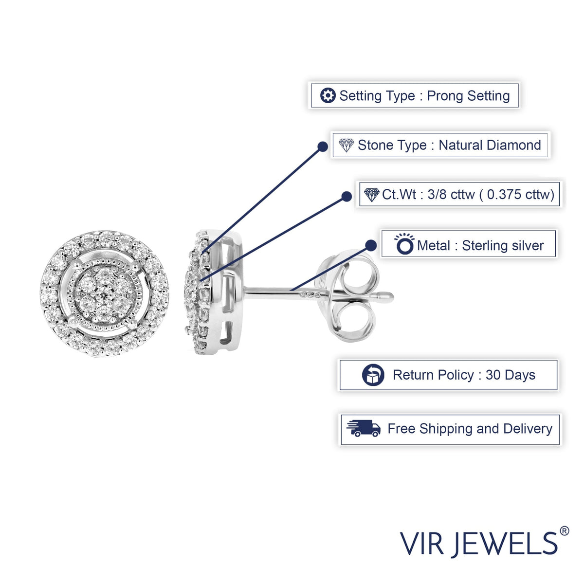 These 3/8 cttw Round Diamond Stud Earrings by Vir Jewels bring timeless elegance to any jewelry collection. Featuring 52 dazzling natural round diamonds in a prong setting, these earrings exude brilliance and charm. The sterling silver base is rhodium-plated for enhanced durability and a lustrous finish. Designed for everyday elegance, they are secured with classic push backs, making them a perfect gift or personal keepsake.