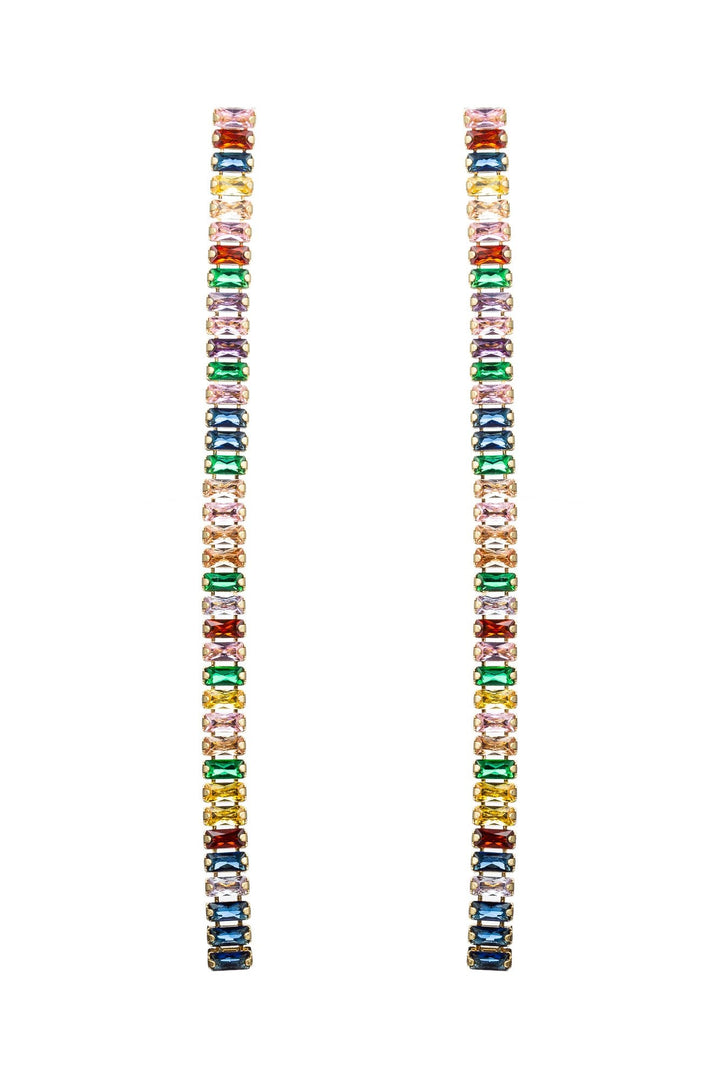 18K gold-plated earrings featuring rainbow CZ crystals. Approximate length: 2.5 inches. Secured with push-back closures.
