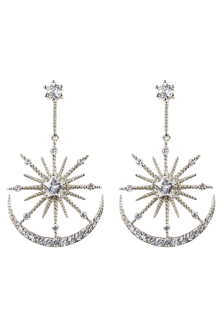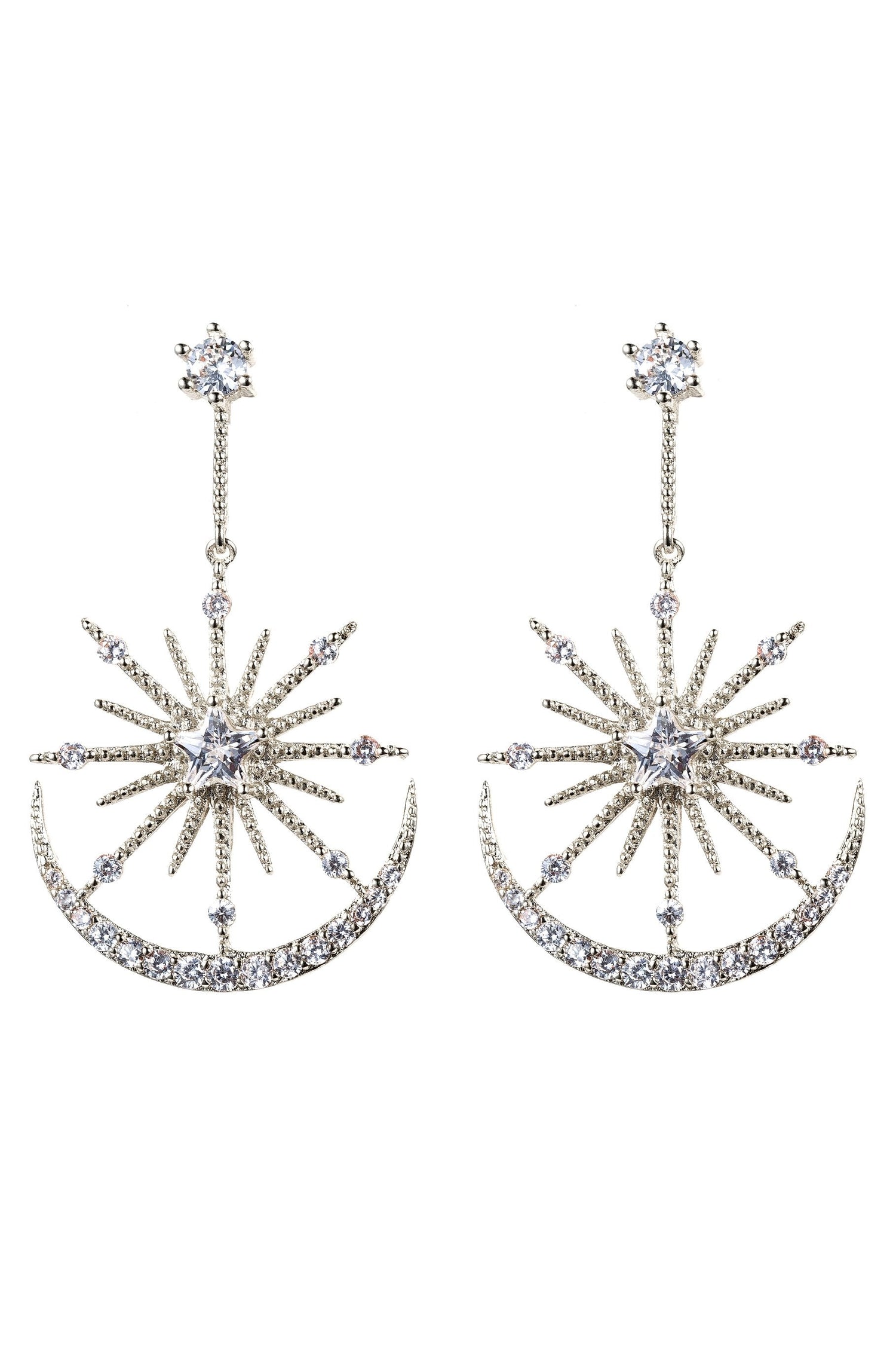 These Stea Earrings - Silver by Eye Candy LA are celestial-inspired dangles that bring a cosmic glow to your jewelry collection. Featuring a combination of moon and star motifs, these shimmering CZ-studded earrings evoke a sense of wonder and mystery. A stellar statement for any occasion.