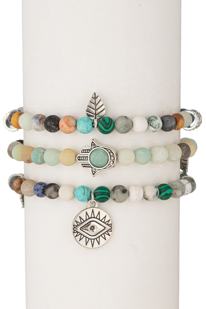 The Toya Beaded Bracelet Set by Eye Candy LA is a mesmerizing trio of bracelets featuring crushed turquoise beads and symbolic charm accents. With hamsa, leaf, and evil eye motifs, this set embodies protection, positivity, and effortless style.
