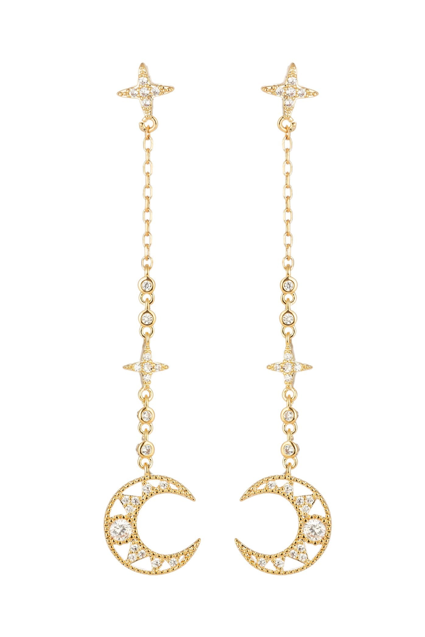 These Laika Crescent Moon Earrings by Eye Candy LA are designed to bring out your inner light. Adorned with CZ crystals, the gold-tone brass crescent moon pendants make these dangle earrings truly shine. With their elegant design, these earrings are perfect for adding a touch of sparkle to any outfit.
