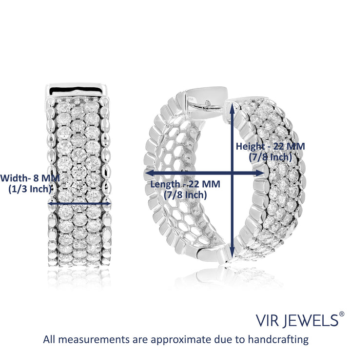 These 2 cttw Diamond Hoop Earrings in .925 Sterling Silver by Vir Jewels are a luxurious choice for those seeking elegance and sparkle. The hoops feature three rows of 76 round diamonds set in a prong setting, bordered by milgrain designs. These earrings are perfect for a bold statement, whether for a special occasion or as an everyday accessory.